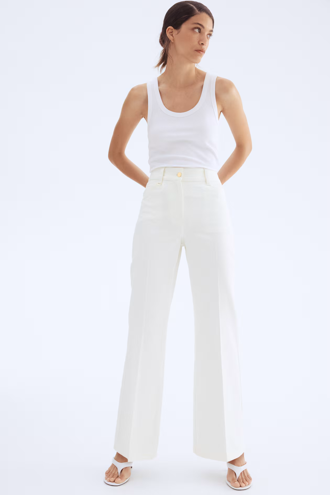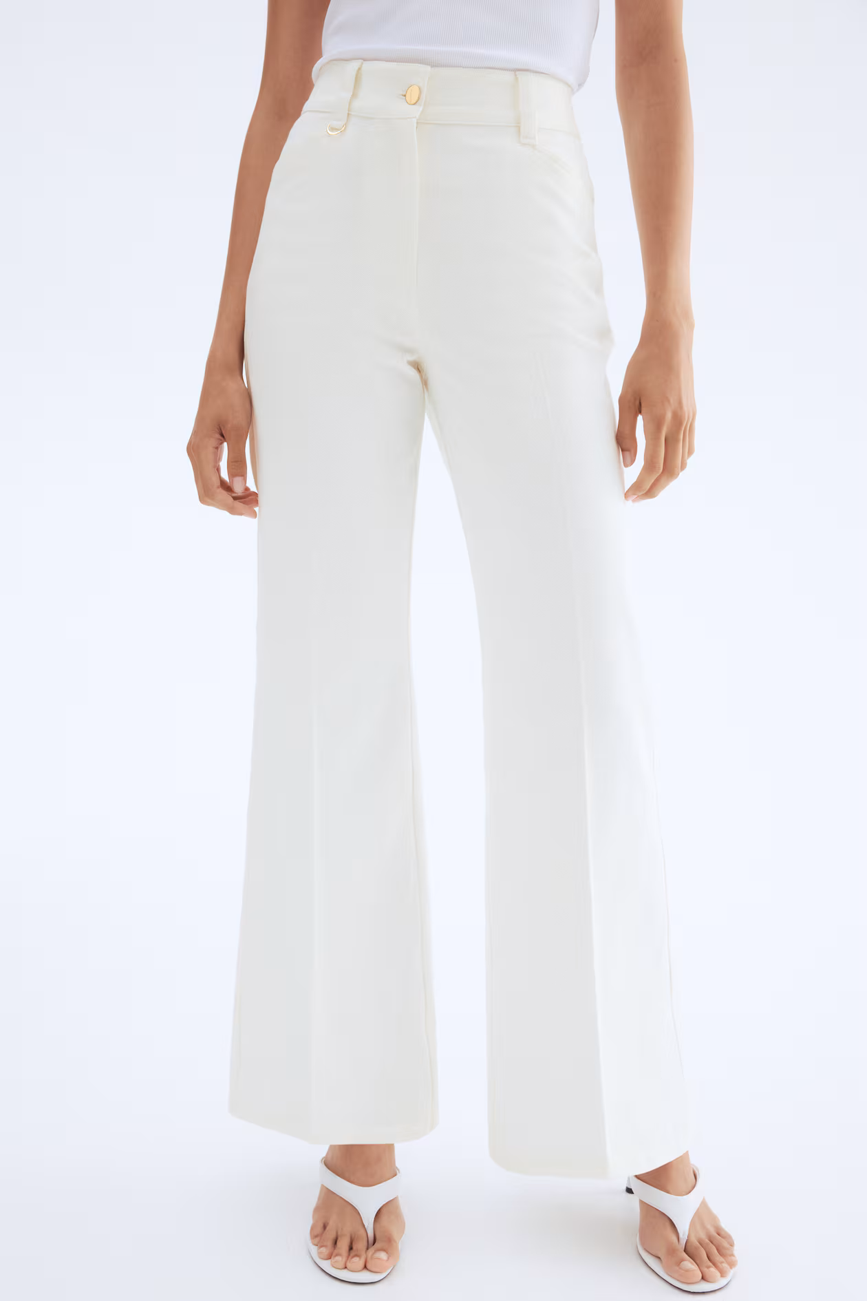 Pants in cotton twill with creases at front and back. High waist, zip fly with button, and a metal D-ring on one belt loop. Front pockets, back pockets, and flared legs.