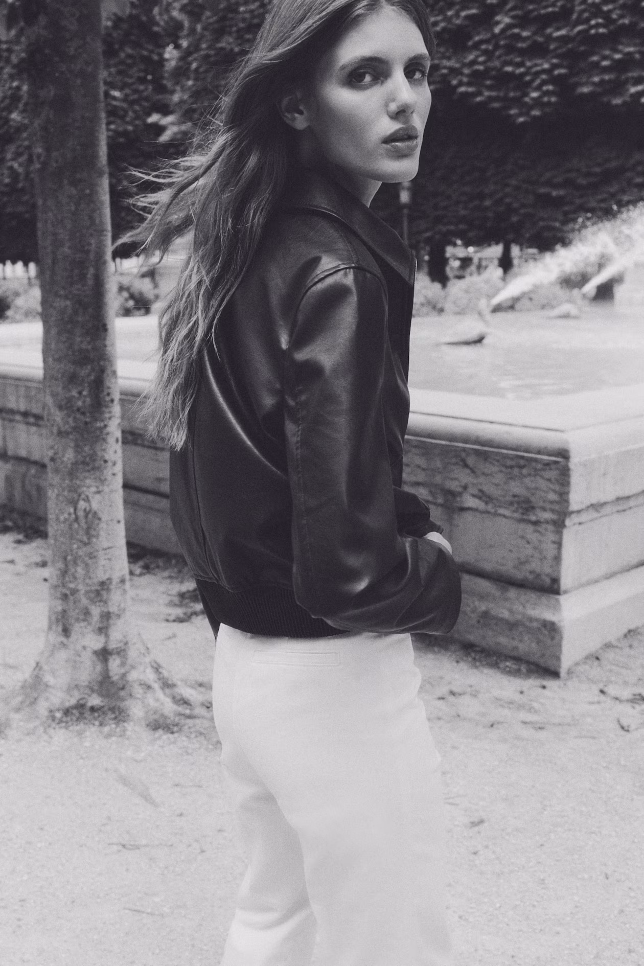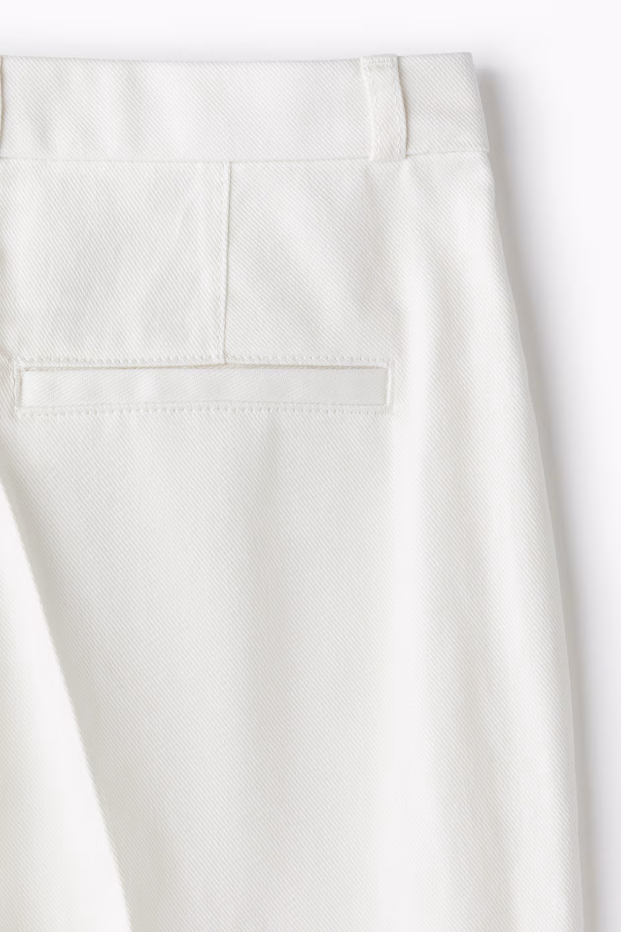 Pants in cotton twill with creases at front and back. High waist, zip fly with button, welt front pockets, and mock back pockets. Flared legs.
