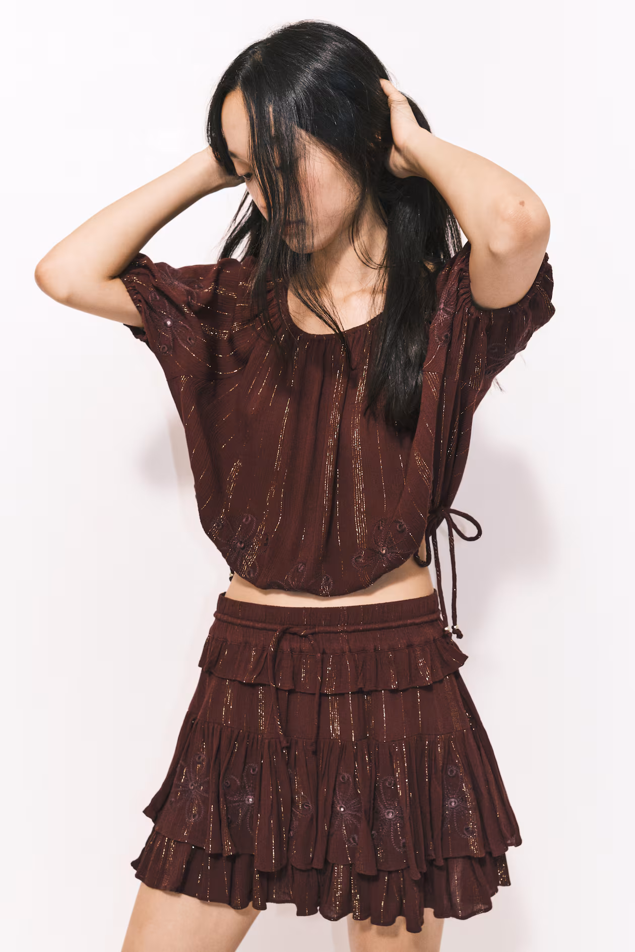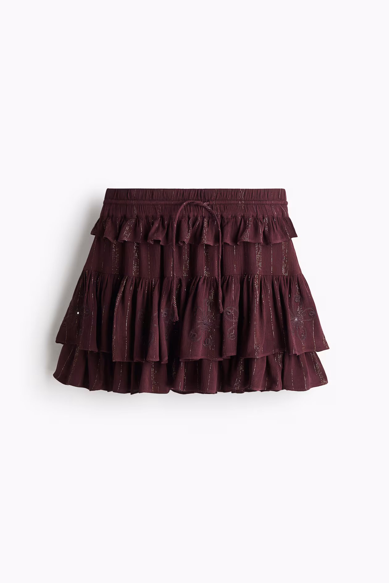 Mini skirt in woven, crinkled viscose fabric with flounces. High waist, drawstring, and covered elastic at waistband. Unlined.