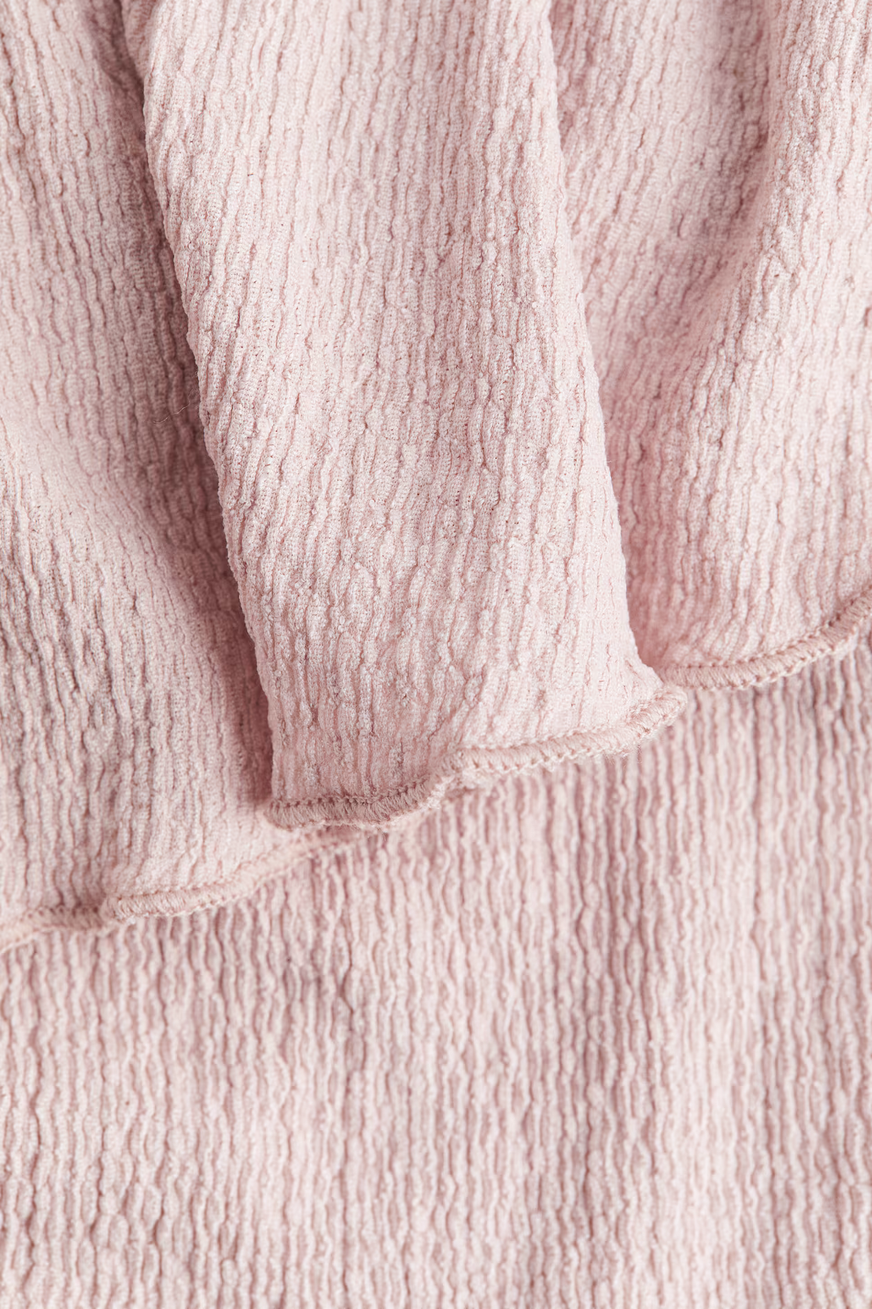 Short, fitted one-shoulder top in textured jersey with overlocked edges. Wide flounce at upper edge.