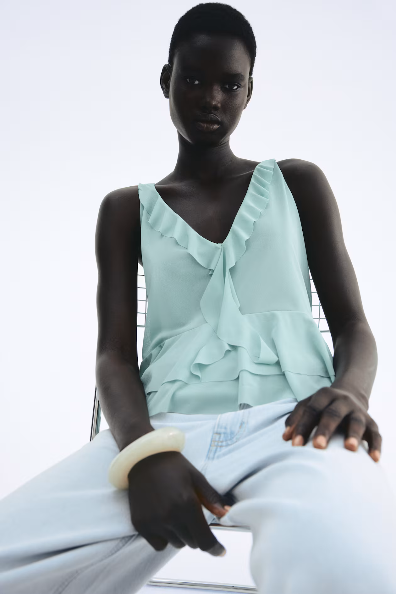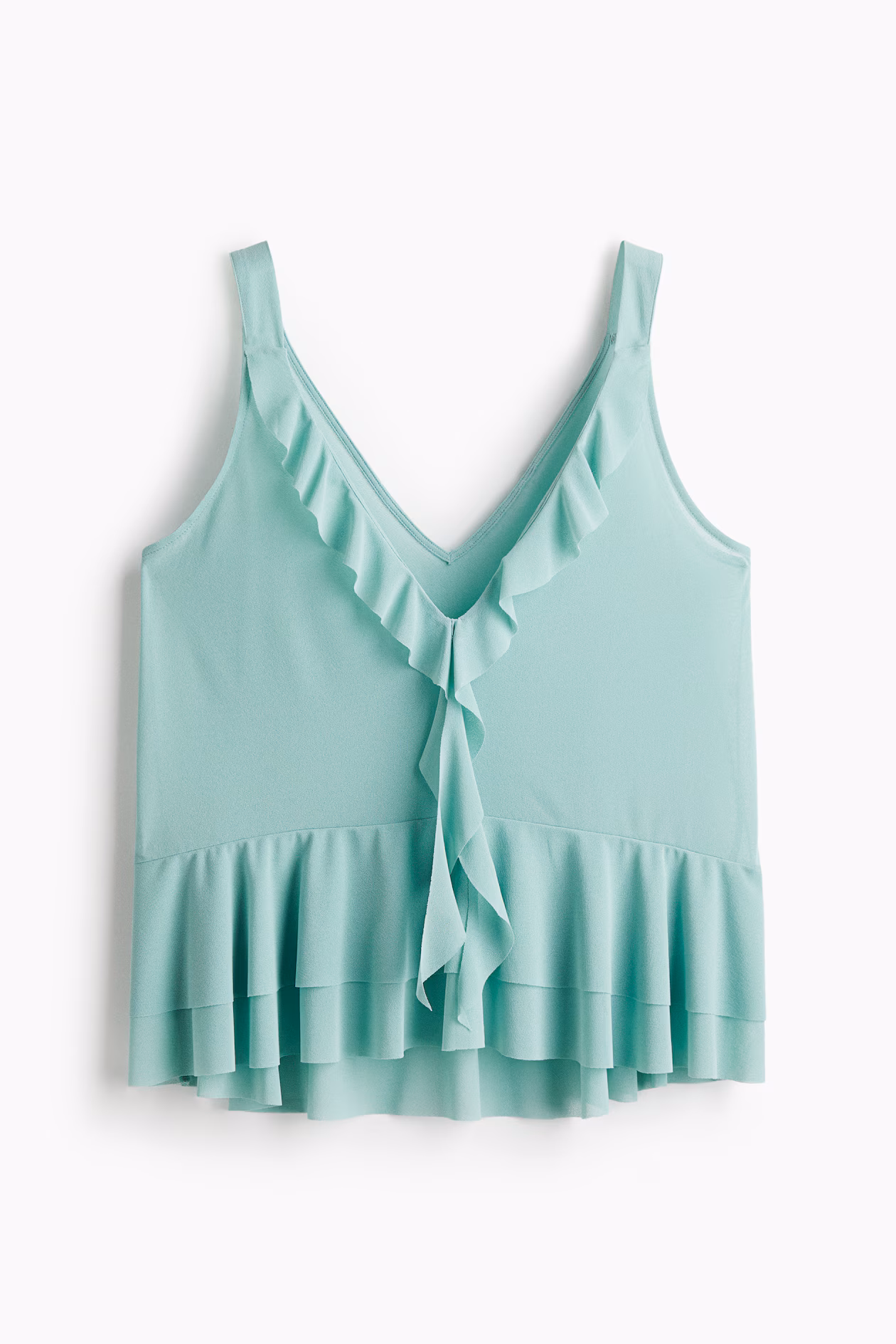Sleeveless top in sheer jersey. Wide shoulder straps, low-cut V-neck with a billowing flounce extending downward at front, and a double-layered flounce at hem.