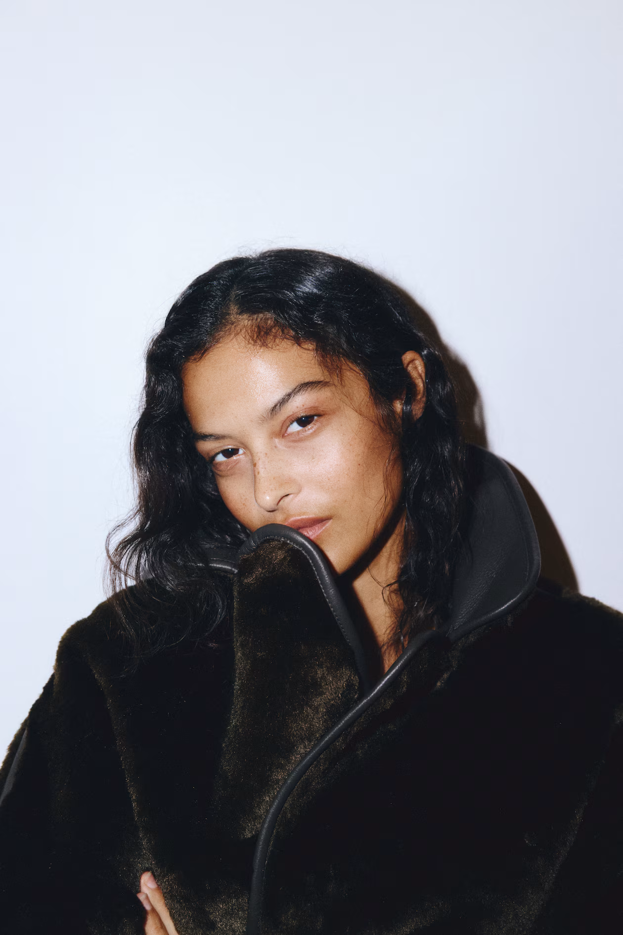 Loose-fit, knee-length coat in fluffy fabric with collar and trim in coated fabric. Buttons at front, welt side pockets, and long raglan sleeves.