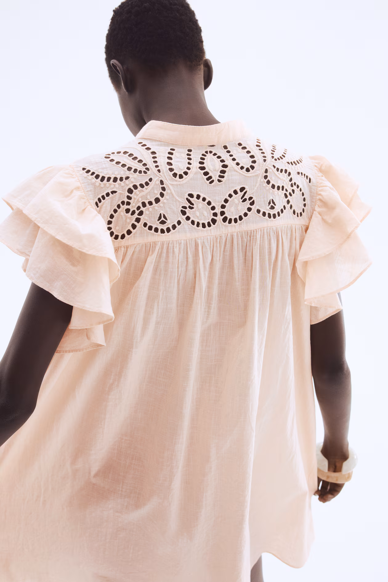 Short, loose-fit dress in woven cotton with a subtle A-line silhouette and an eyelet-embroidered yoke. Band collar, V-shaped opening at front, and gathers below yoke. Double-layered flutter sleeves. Unlined.