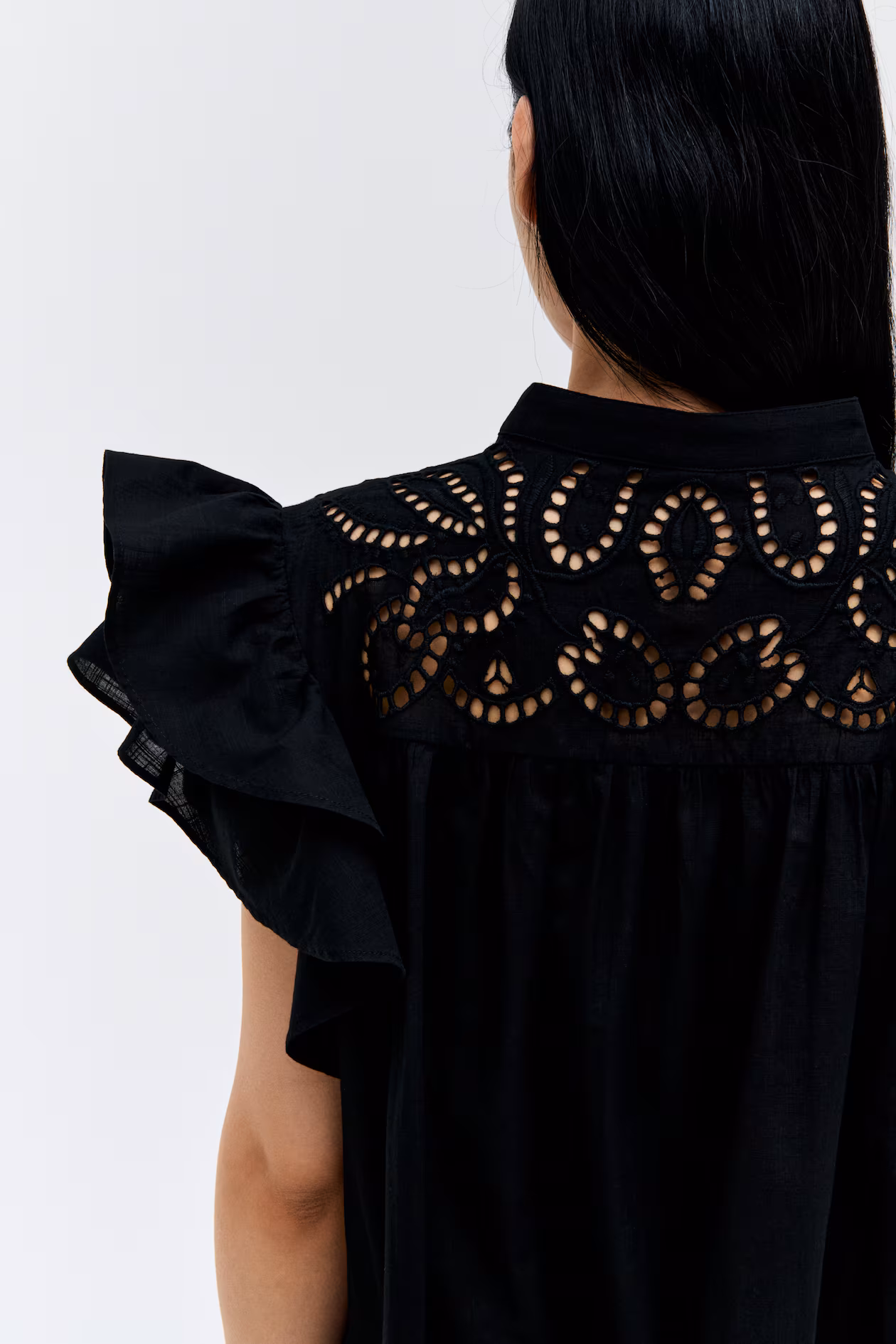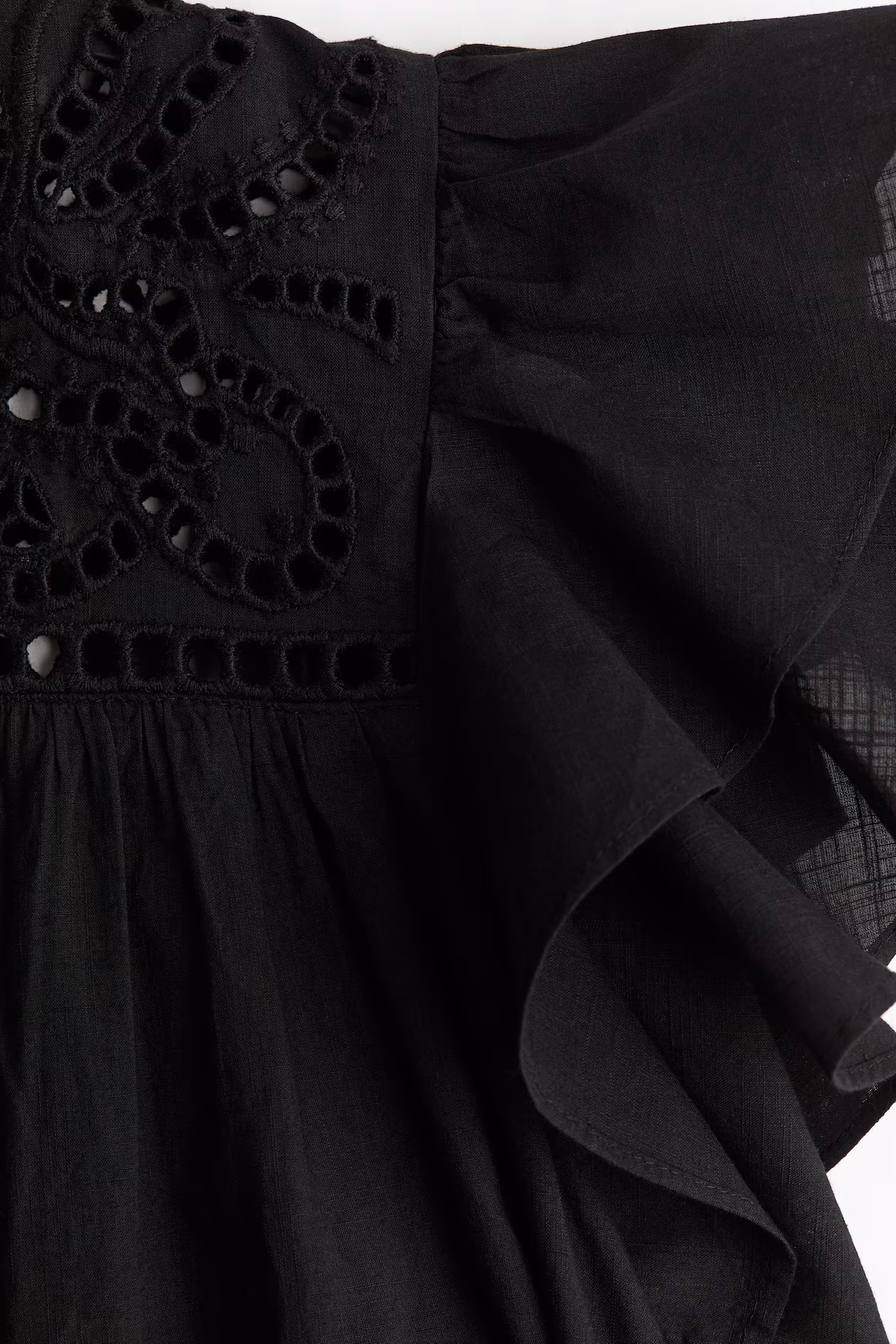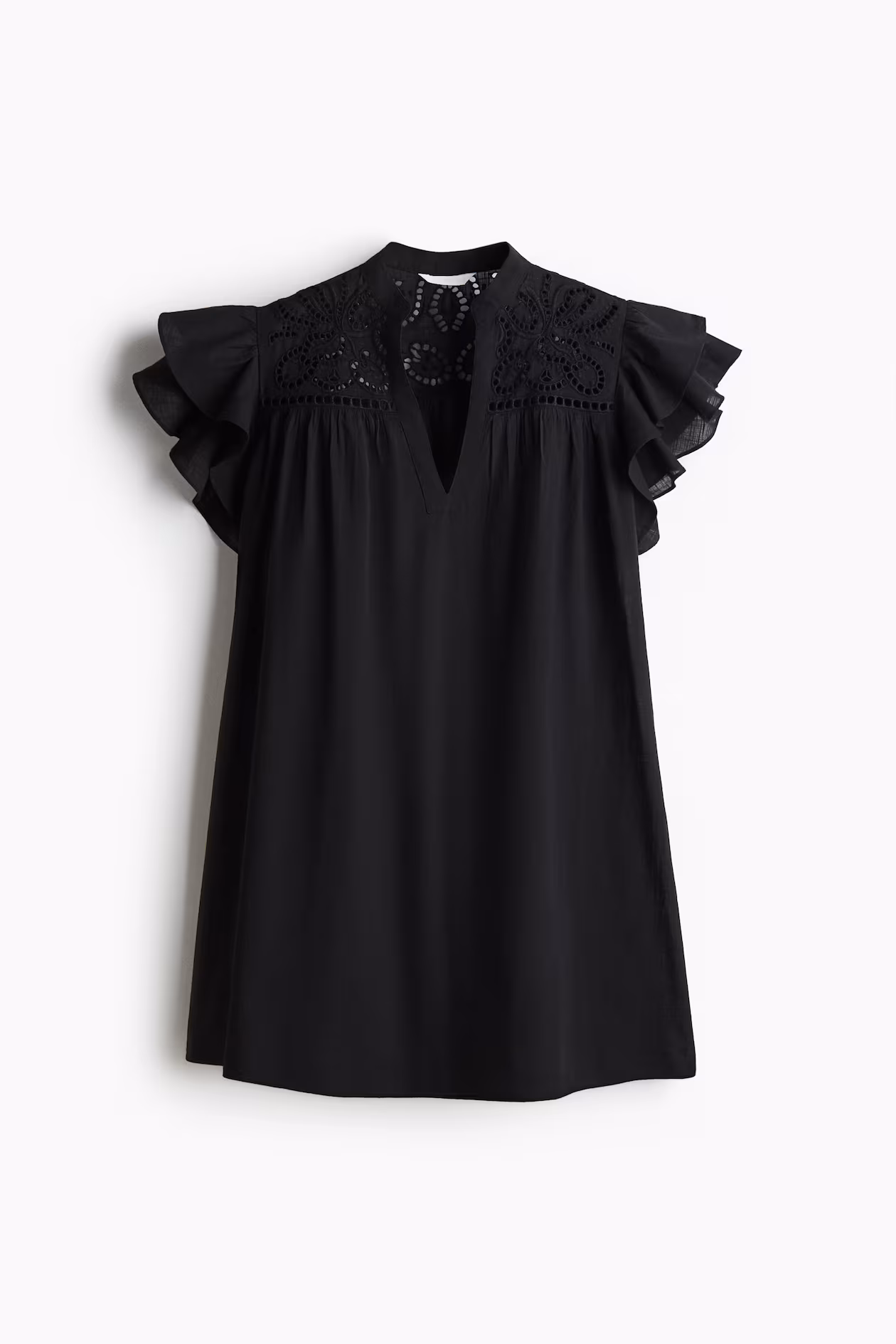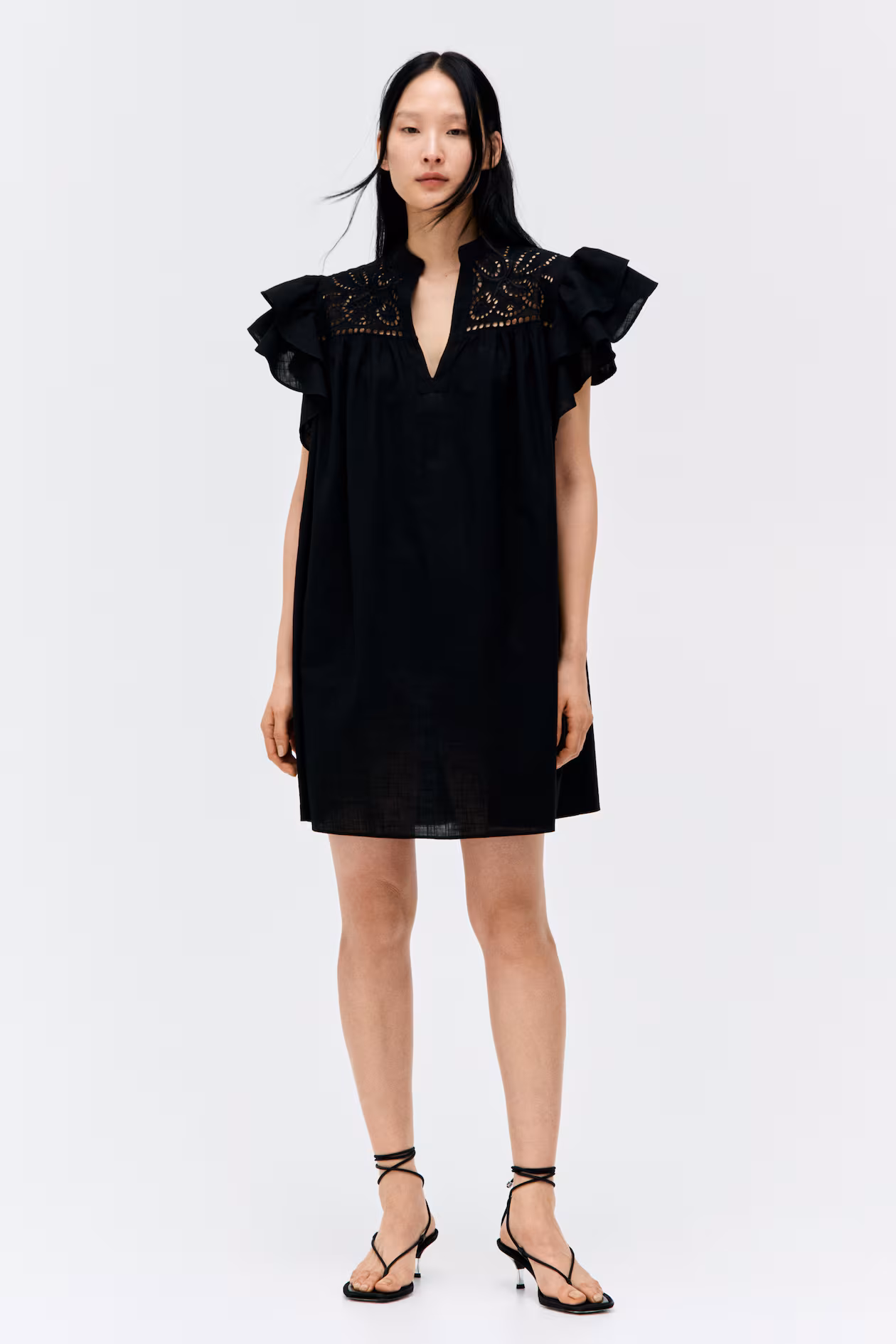 Short, loose-fit dress in woven cotton with a subtle A-line silhouette and an eyelet-embroidered yoke. Band collar, V-shaped opening at front, and gathers below yoke. Double-layered flutter sleeves. Unlined.