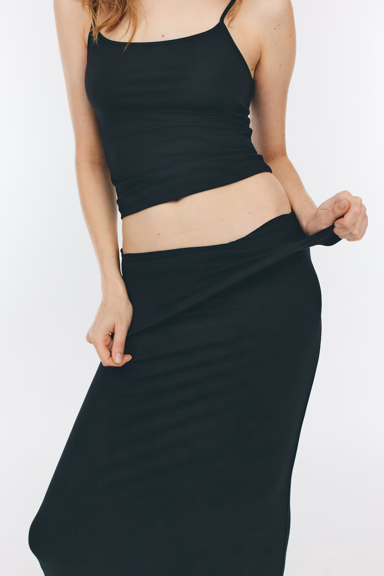 Fitted maxi skirt in jersey. Sewn, foldover waistband with gathers at sides.