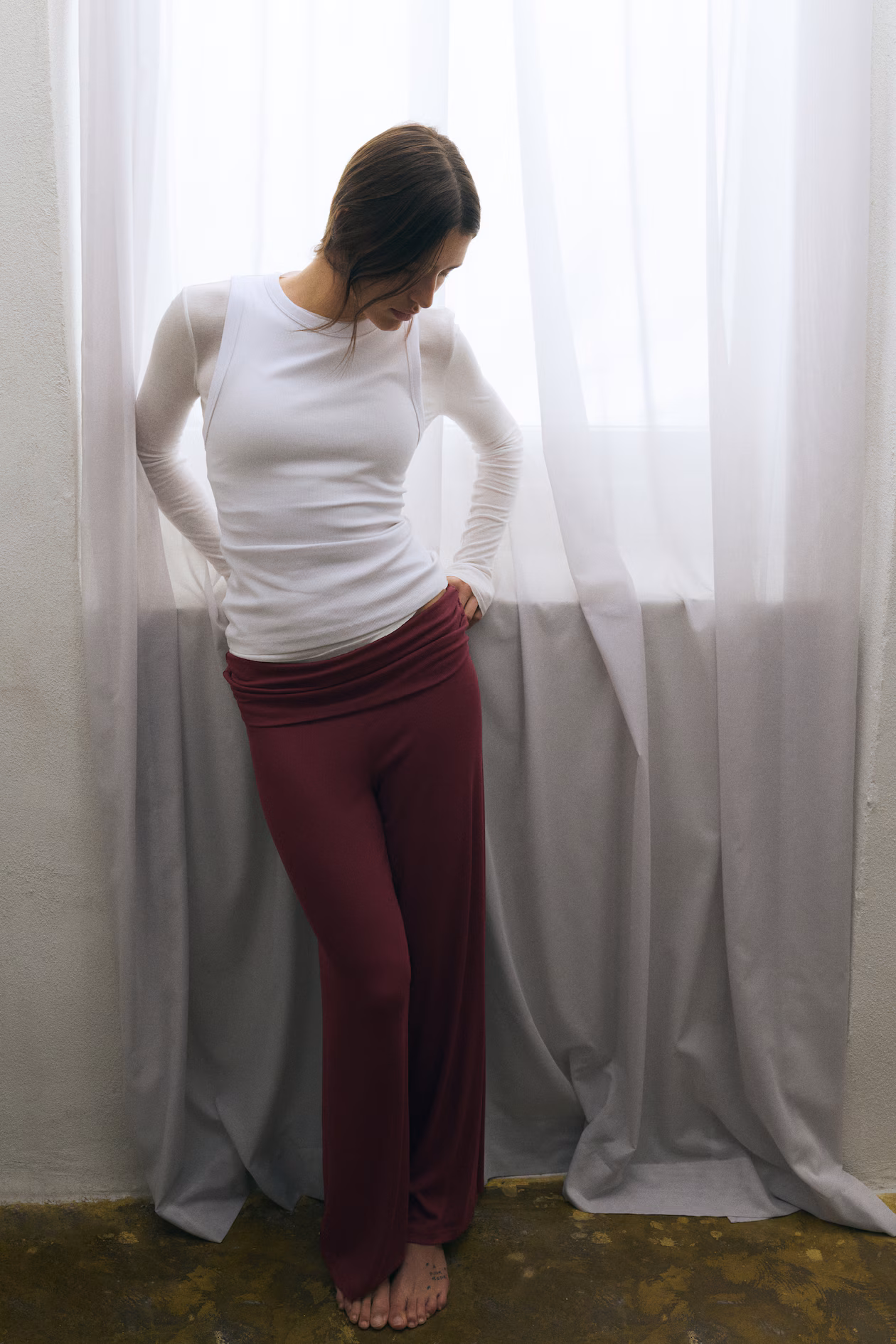Sports leggings in ribbed jersey. Wide, foldover waistband and flared legs.