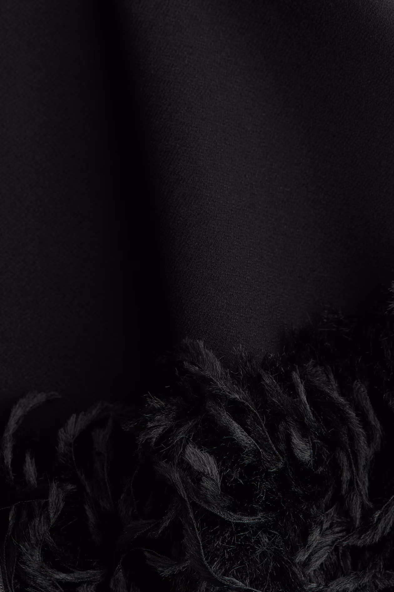 Sleeveless mini dress in thick jersey. Round neck, darts at bust, and a concealed zipper at back. Multiple rows of feather-look fringe at hem.