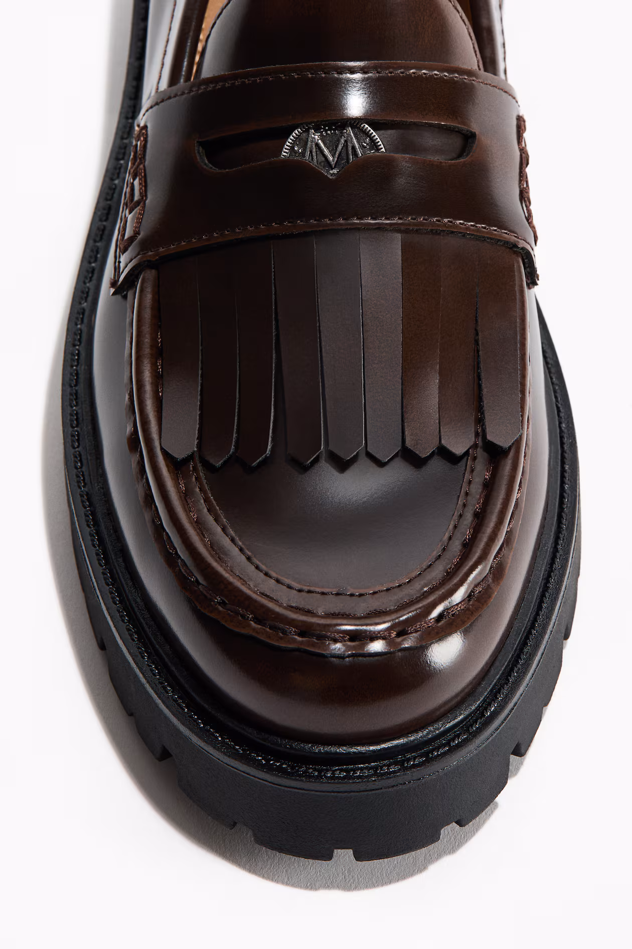 Loafers in coated fabric. Penny keeper at front with a decorative metal coin and a row of fringe. Cotton twill lining and chunky soles.