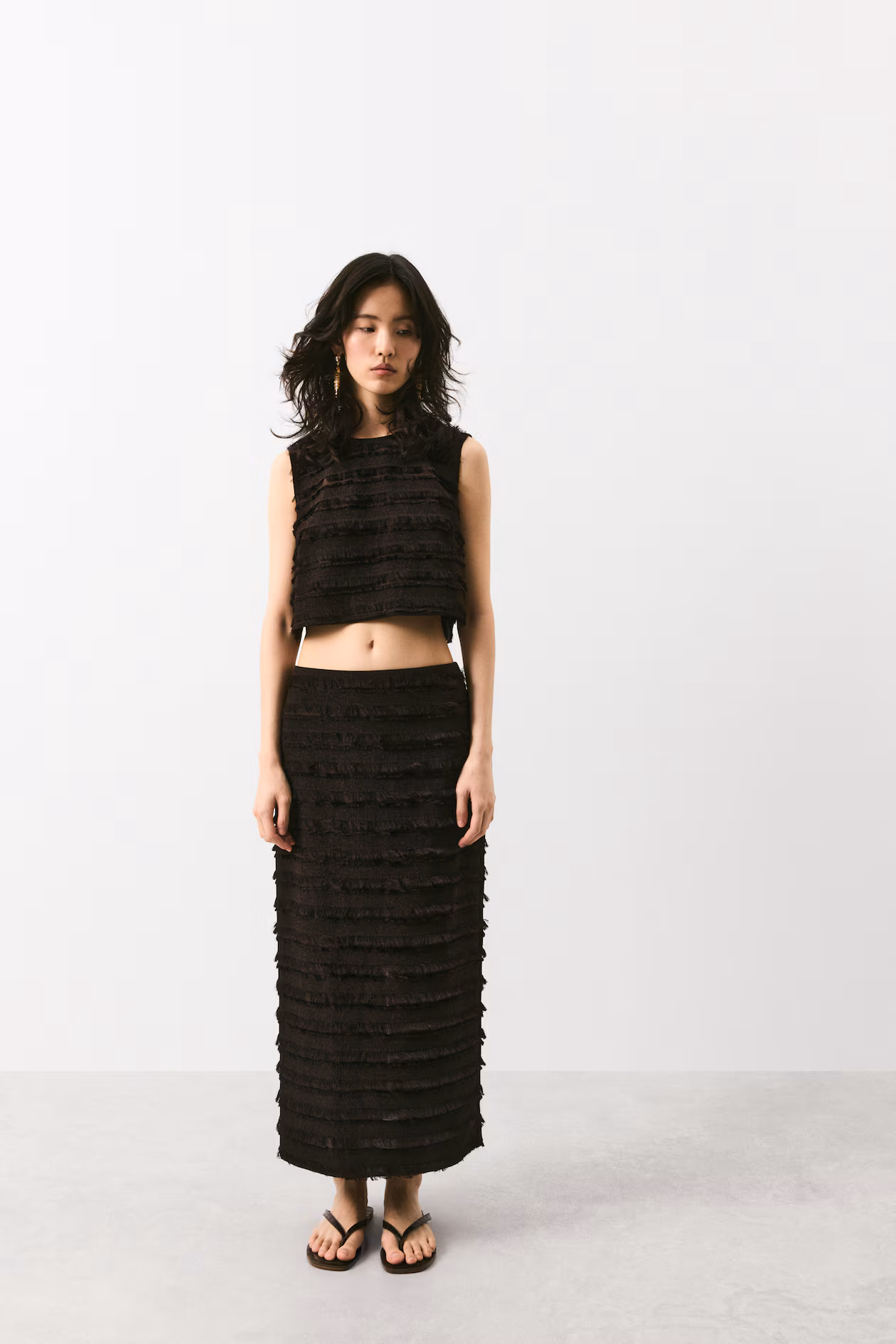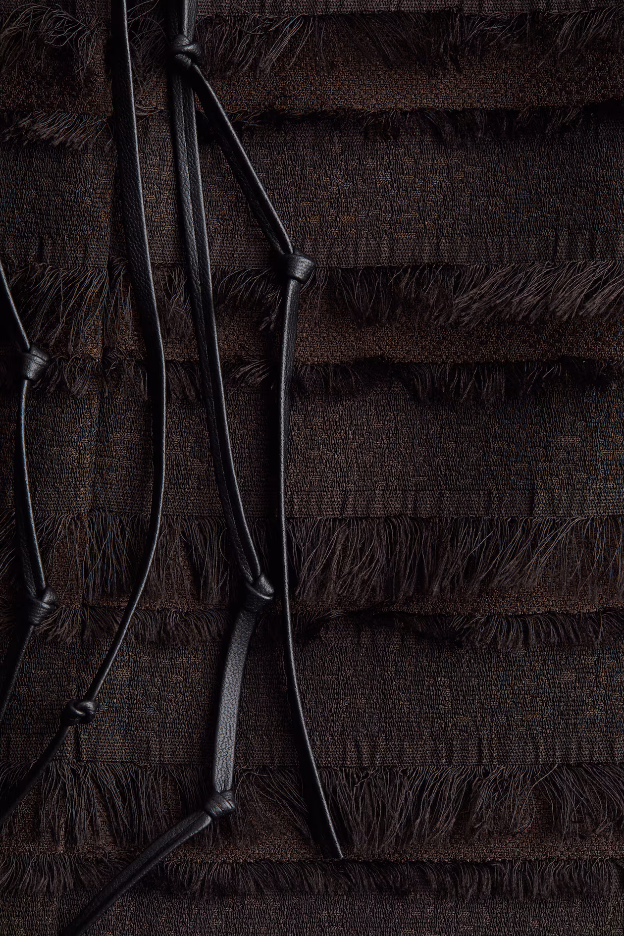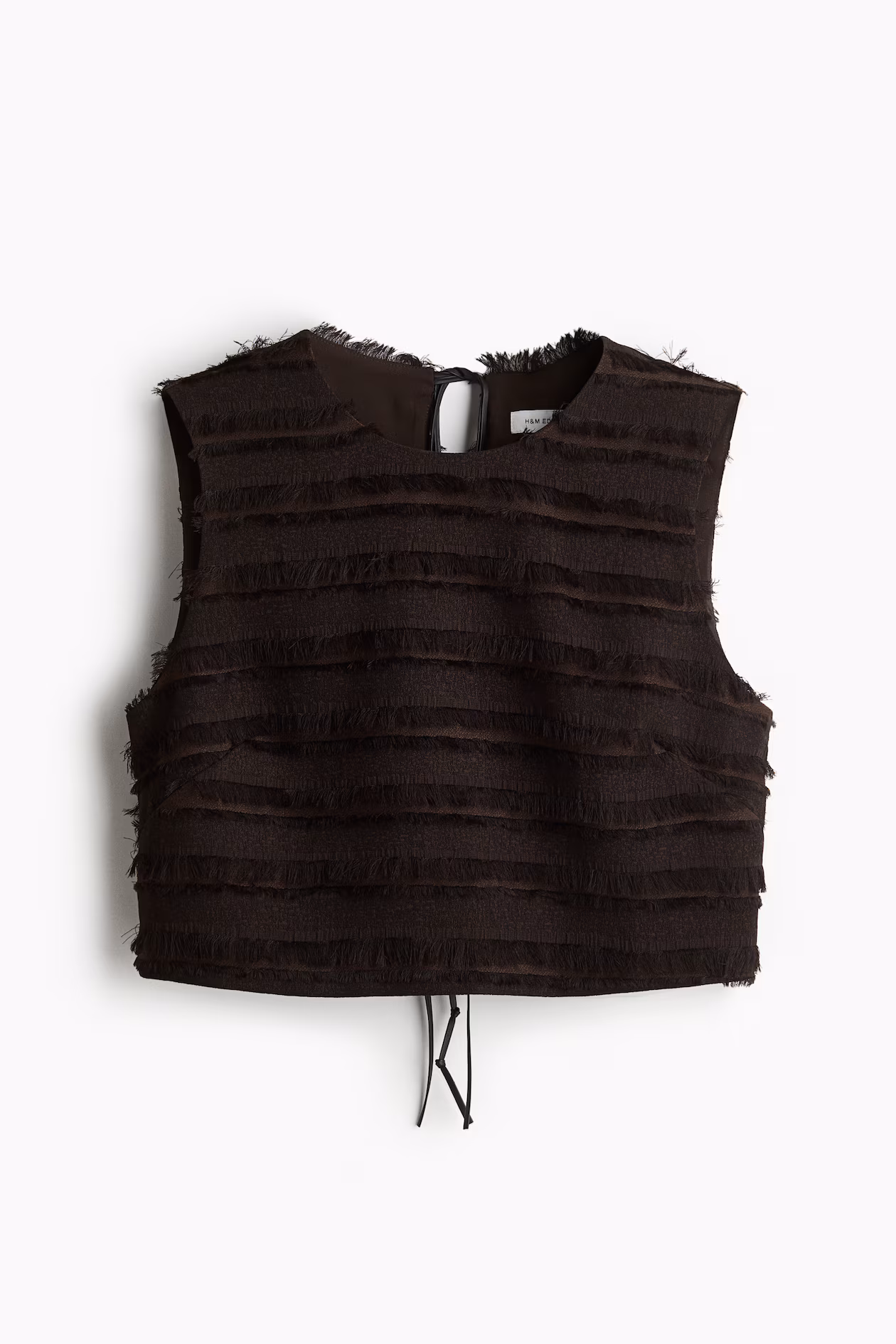 Sleeveless crop top in woven fabric covered with rows of fringe. Round neckline, keyhole opening at back with narrow, coated ties, and a straight-cut hem with slit at sides. Lined.