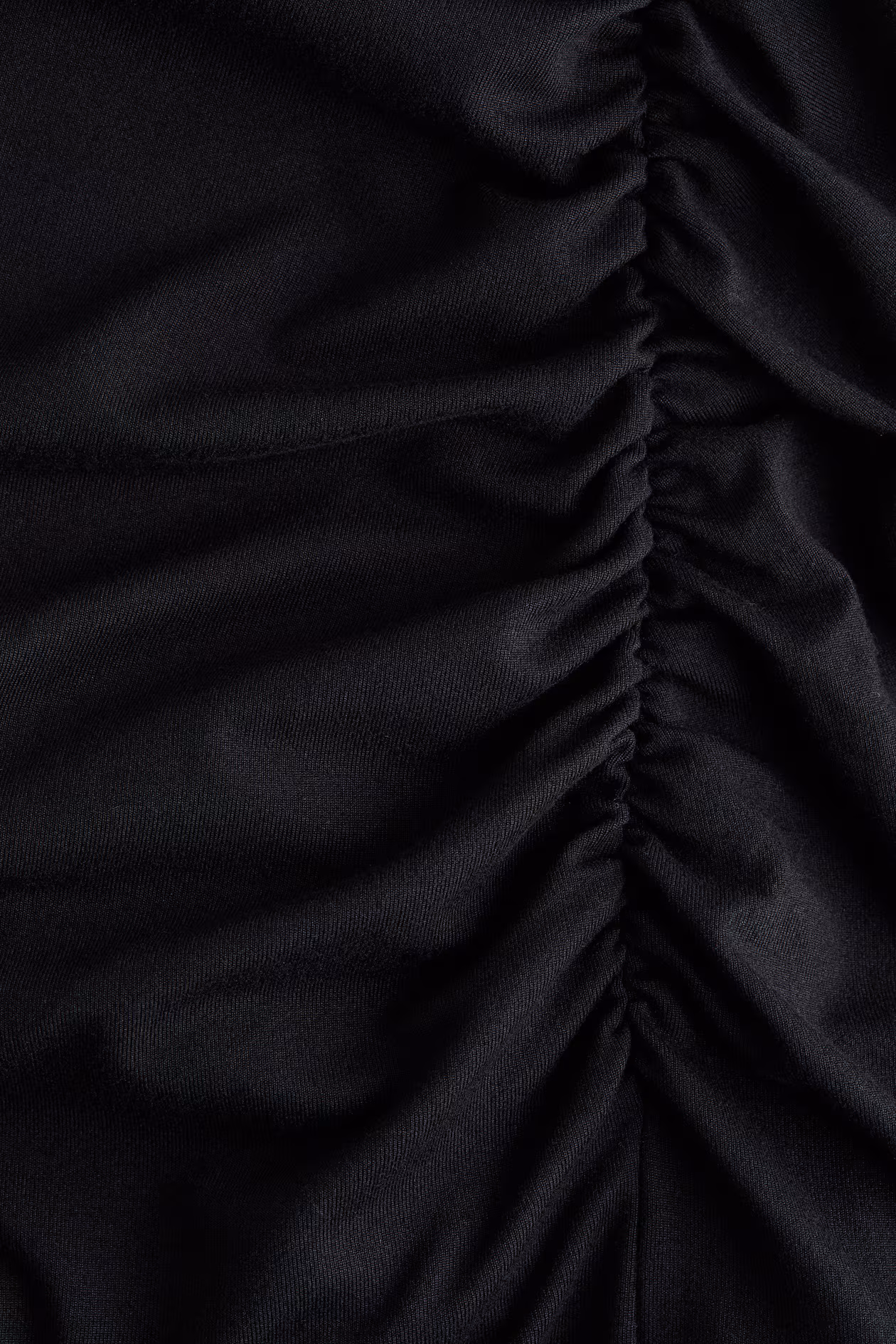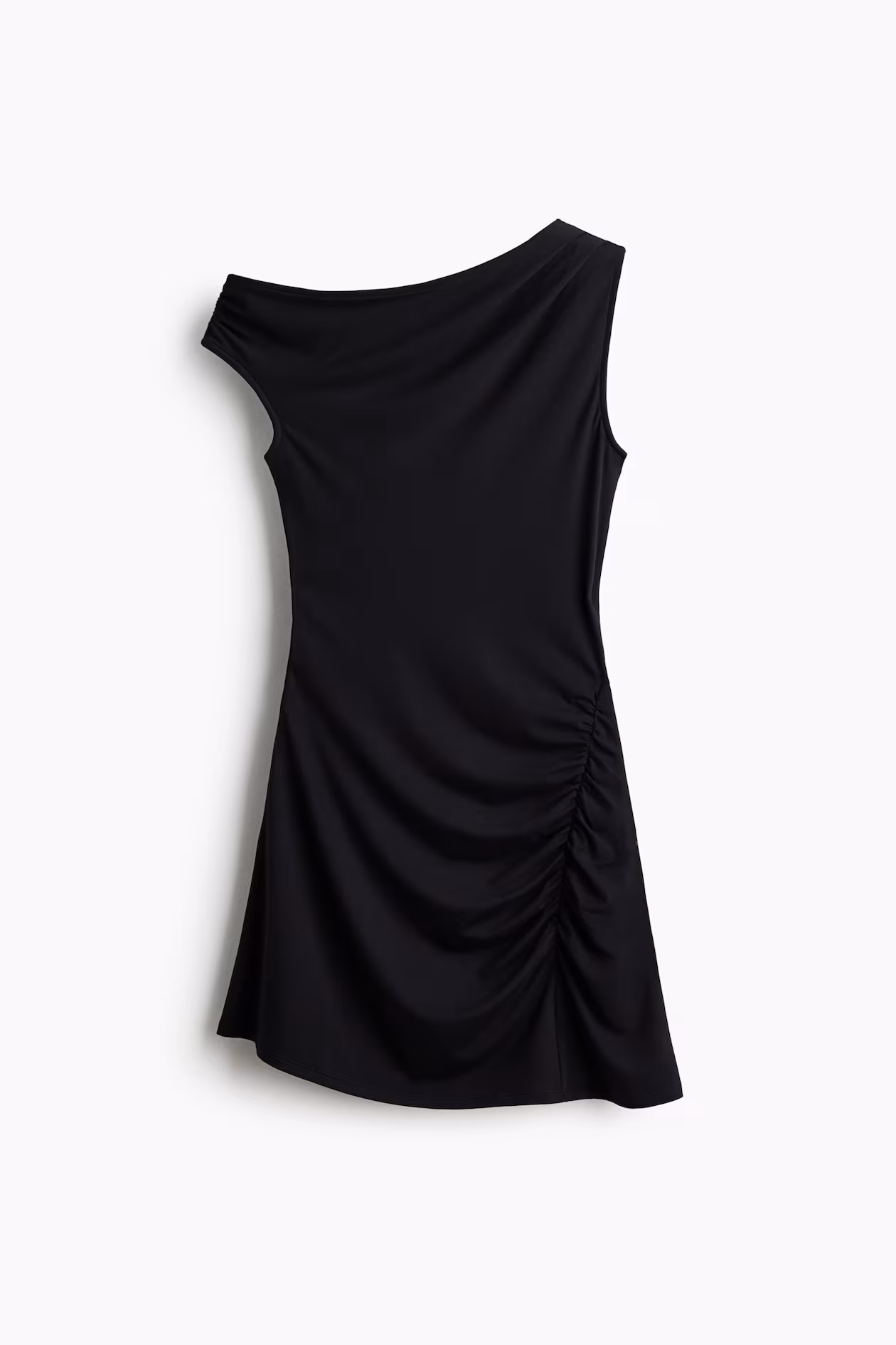 Short, sleeveless one-shoulder dress in jersey with a gathered sleeve panel and pleats on one shoulder. Gathered, forward-facing side seam at one side for a gently draped effect.