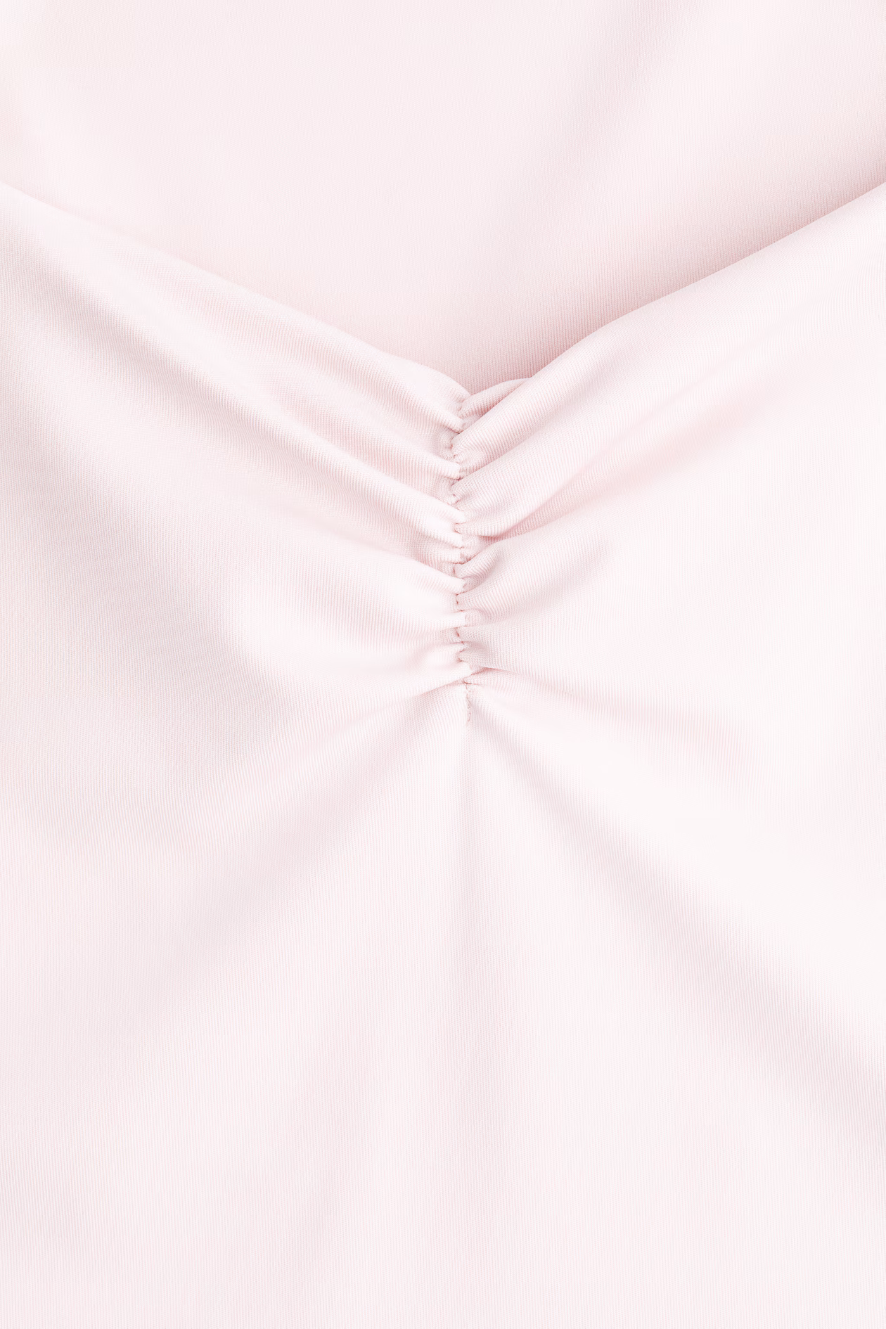Short, fitted sleeveless top in soft jersey. Low-cut sweetheart neckline and a gathered seam at the center bust.