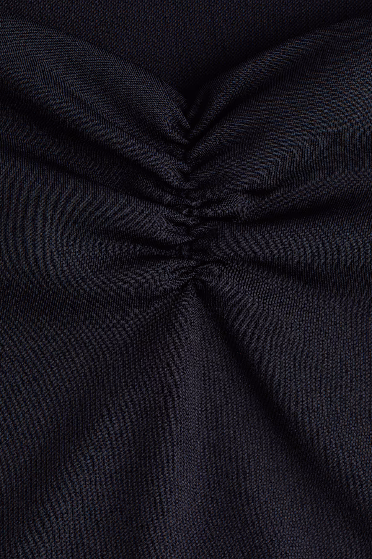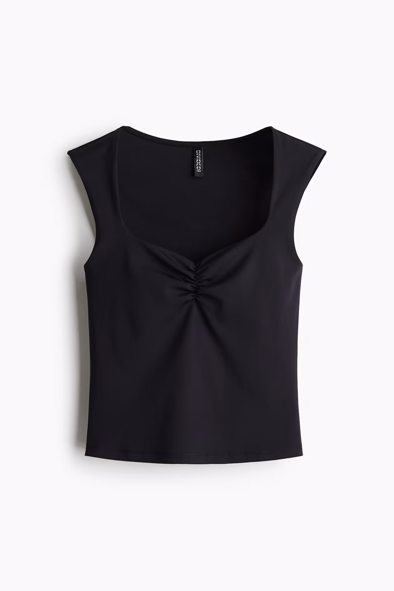 Short, fitted sleeveless top in soft jersey. Low-cut sweetheart neckline and a gathered seam at the center bust.