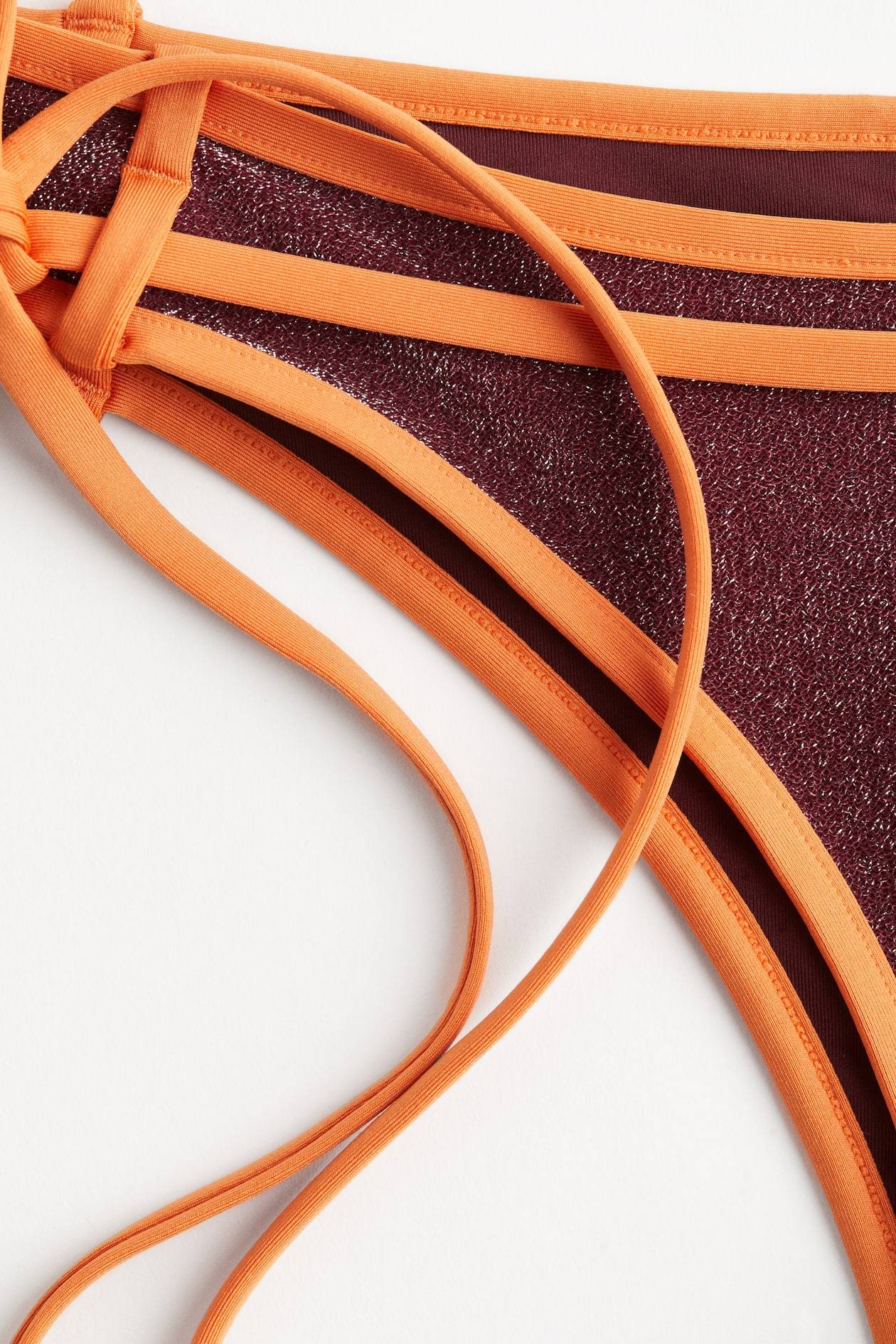 Fully lined bikini bottoms with shimmery metallic thread. Glittery fabric paired with contrasting binding and tie belt brings a playful vibe. Mid-rise waist and a narrow tie belt threaded through small loops at front and back to tie at one side. High-cut back.