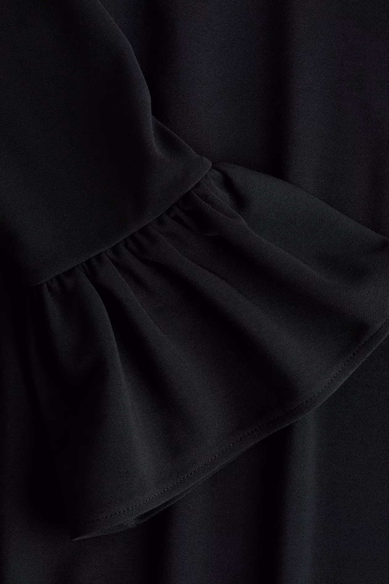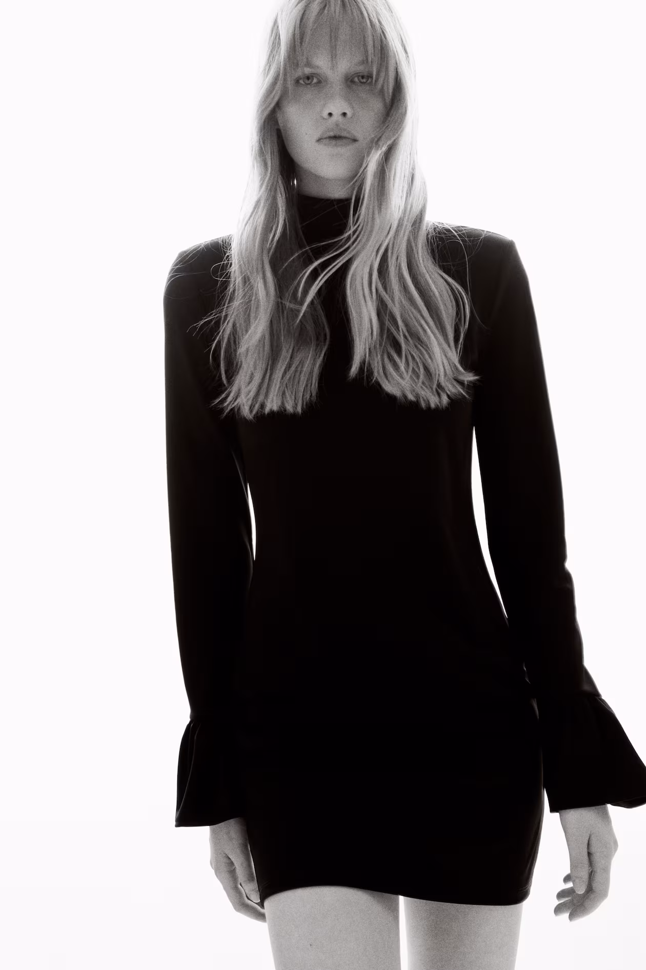 Short, fitted dress in jersey with glittery thread. Mock turtleneck, concealed zipper at back, and shoulder pads for a defined silhouette. Long sleeves with a wide ruffle at cuffs.