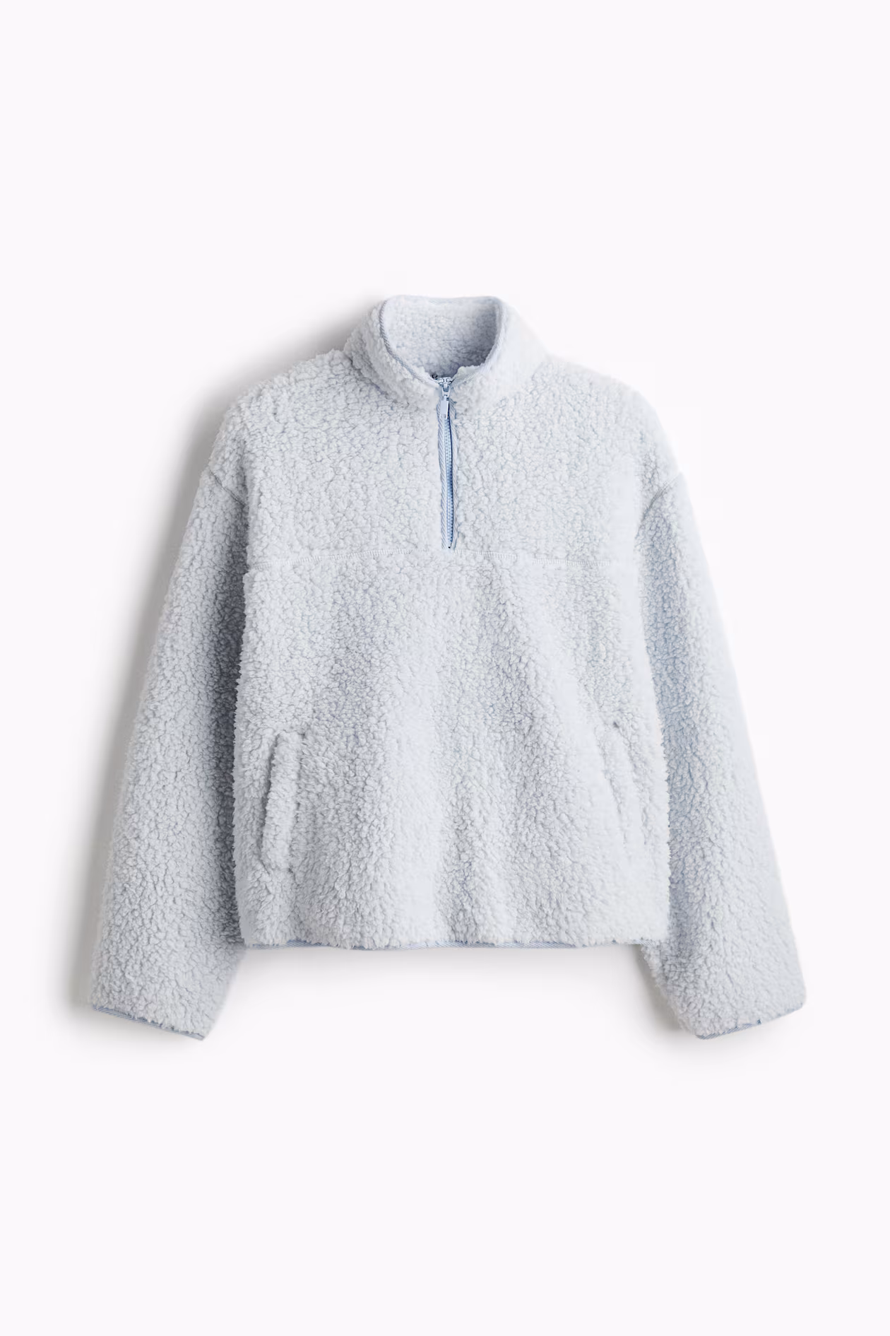 Oversized sweatshirt in soft teddy fleece with jersey binding. Stand-up collar, half-zip, and yoke at front and back. Welt front pockets, dropped shoulders, and long sleeves.