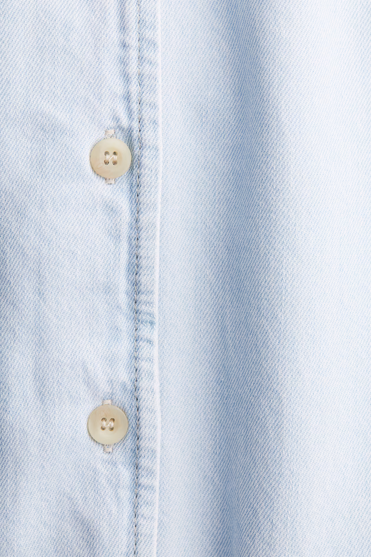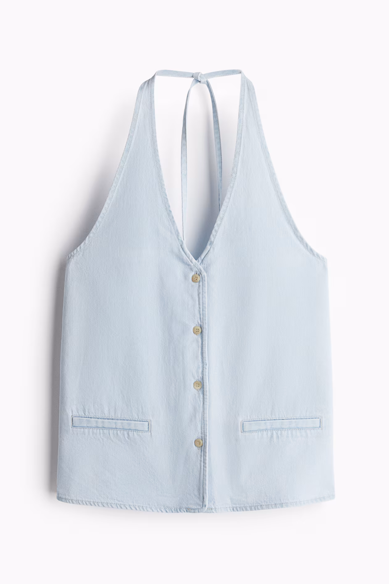 Halterneck vest in supersoft, featherlight denim. V-neck, buttons at front, and welt front pockets. Narrow ties at back of neck and at back.