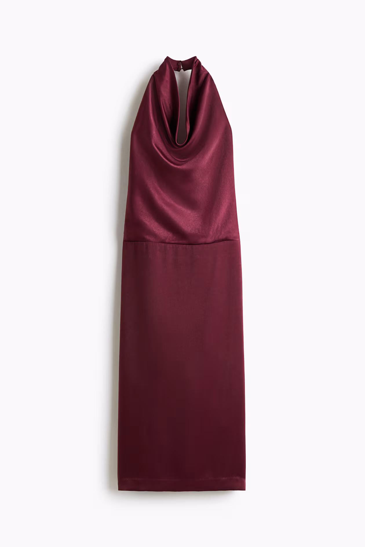 Fitted, knee-length halterneck dress in softly draped satin. Cowl neck, button-loop fasteners at back of neck, and a concealed zipper at back. Straight-cut hem with a slit at back. Unlined.