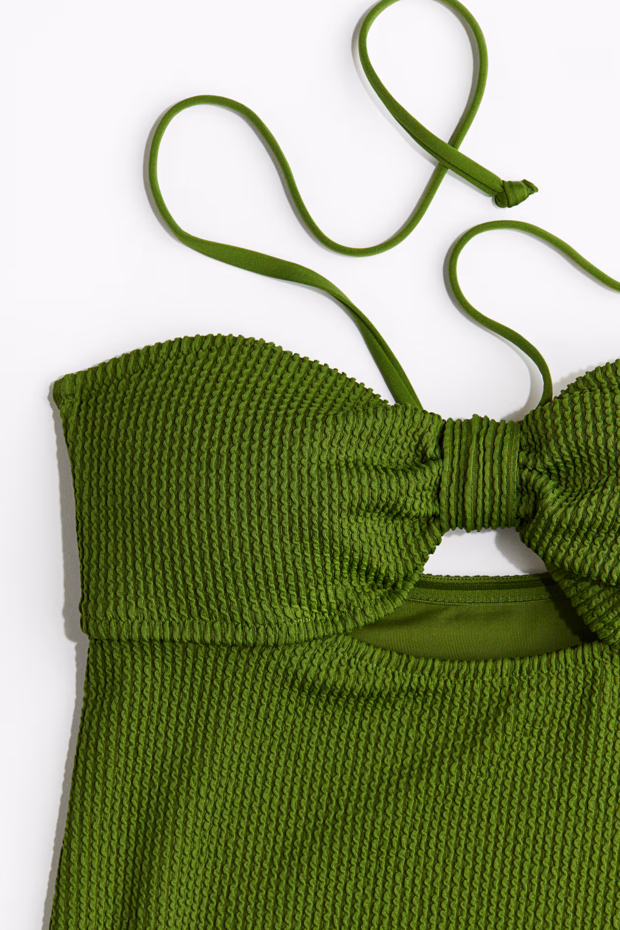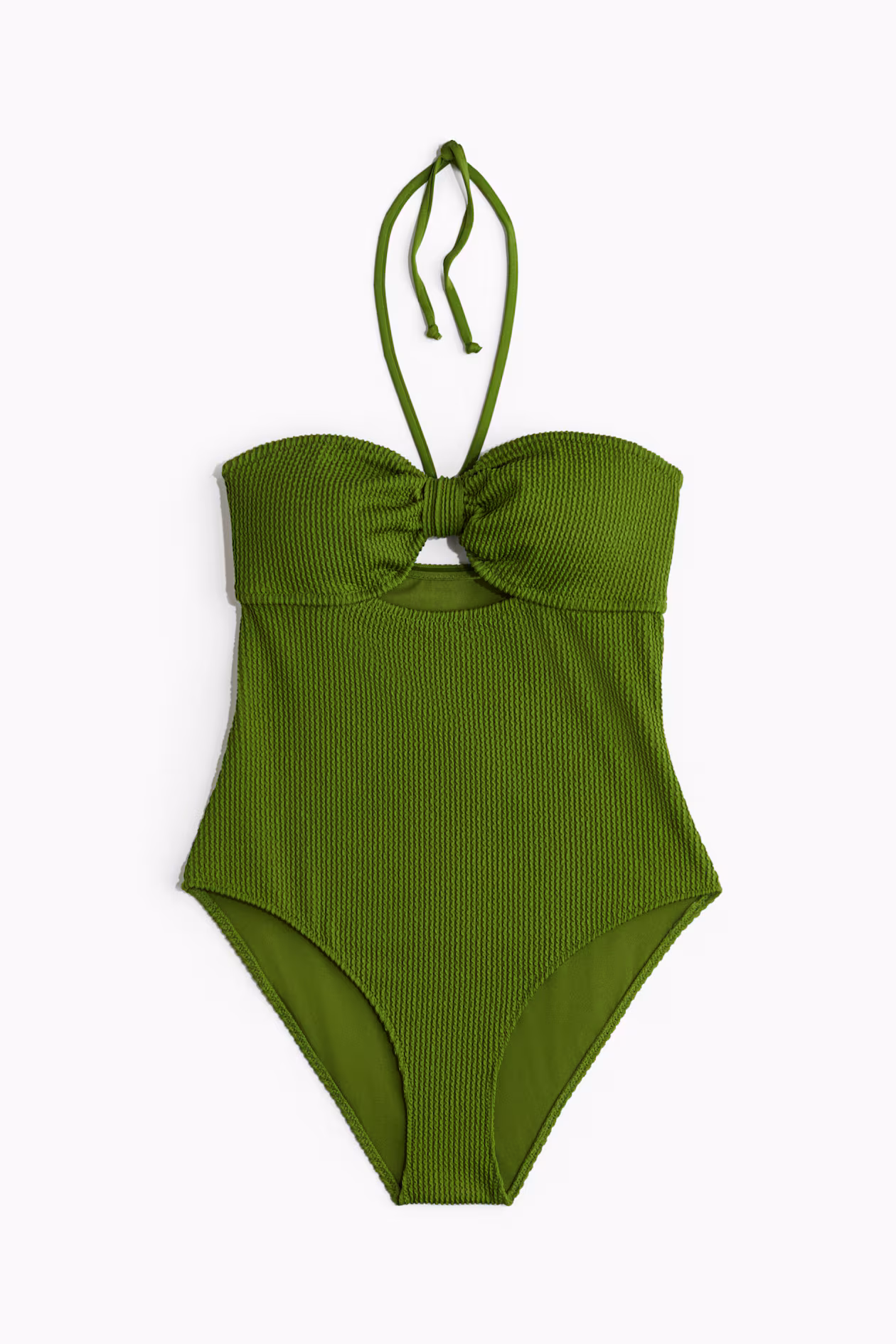Fully lined swimsuit with narrow halterneck ties. Silicone trim inside upper edge, cups with removable inserts for shaping and good support, and boning in sides. Cutout section at front with decorative knot. Medium coverage at back.