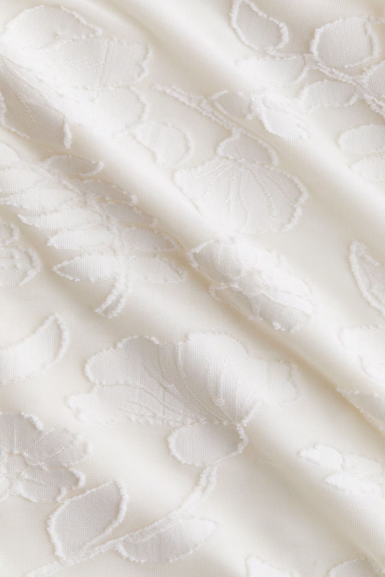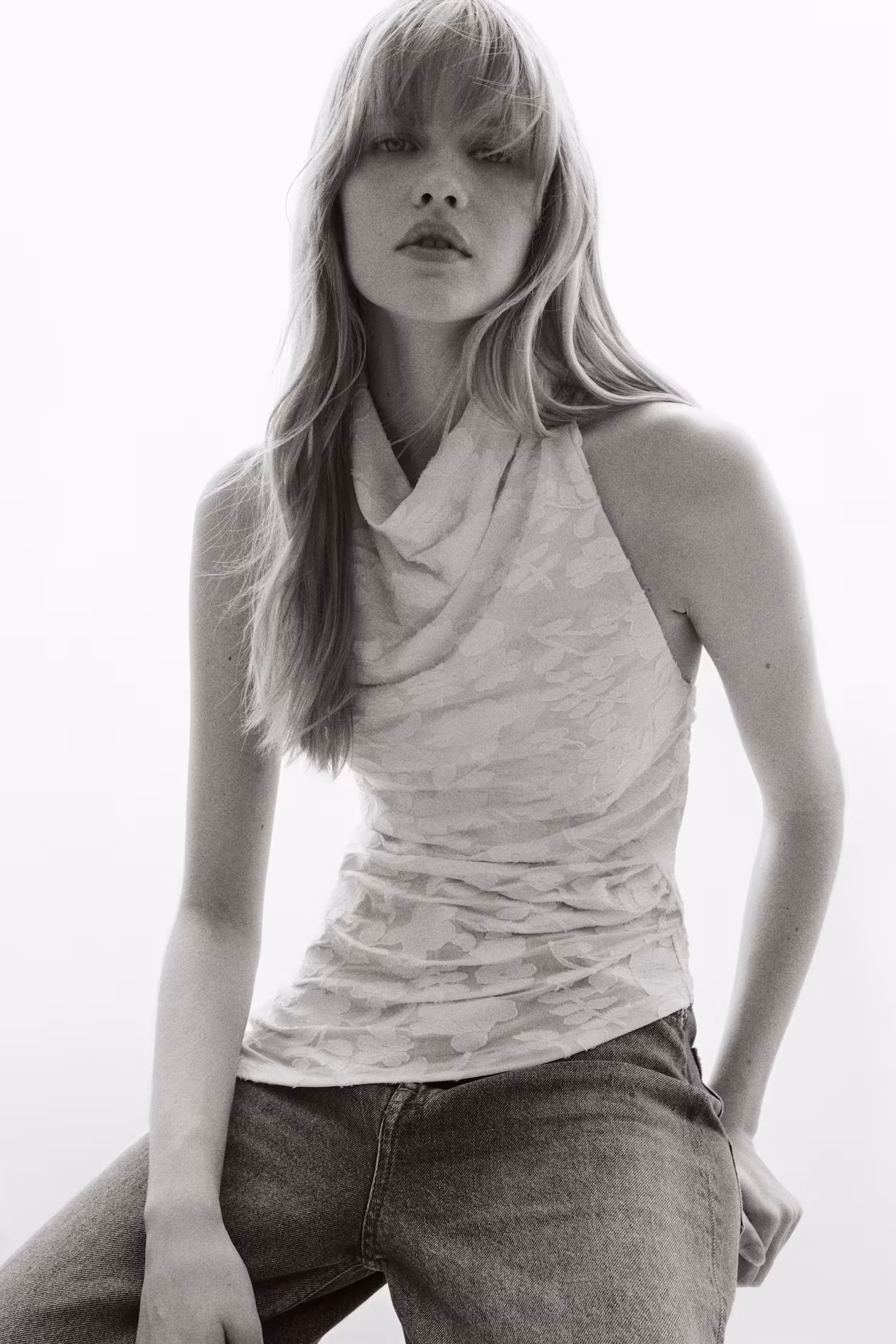 Fitted, sleeveless top in jacquard jersey. Wide halterneck strap with concealed button-loop fastening at back of neck. Cowl neck, gathers at one side of waist, and an asymmetric hem.