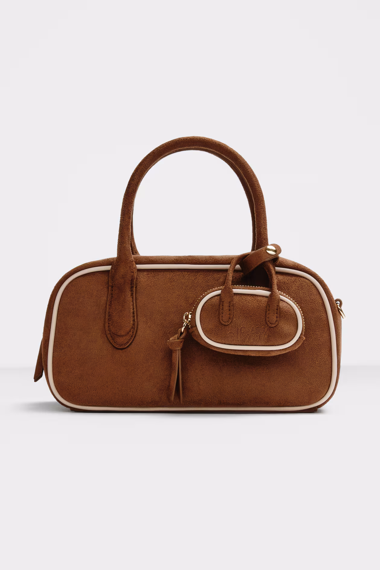 Limited Edition. Handbag with a napped finish. Detachable, adjustable shoulder strap, two handles and a metal zipper at top, and three inner compartments. Lined. Features a mini-bag-shaped charm with a debossed text motif.