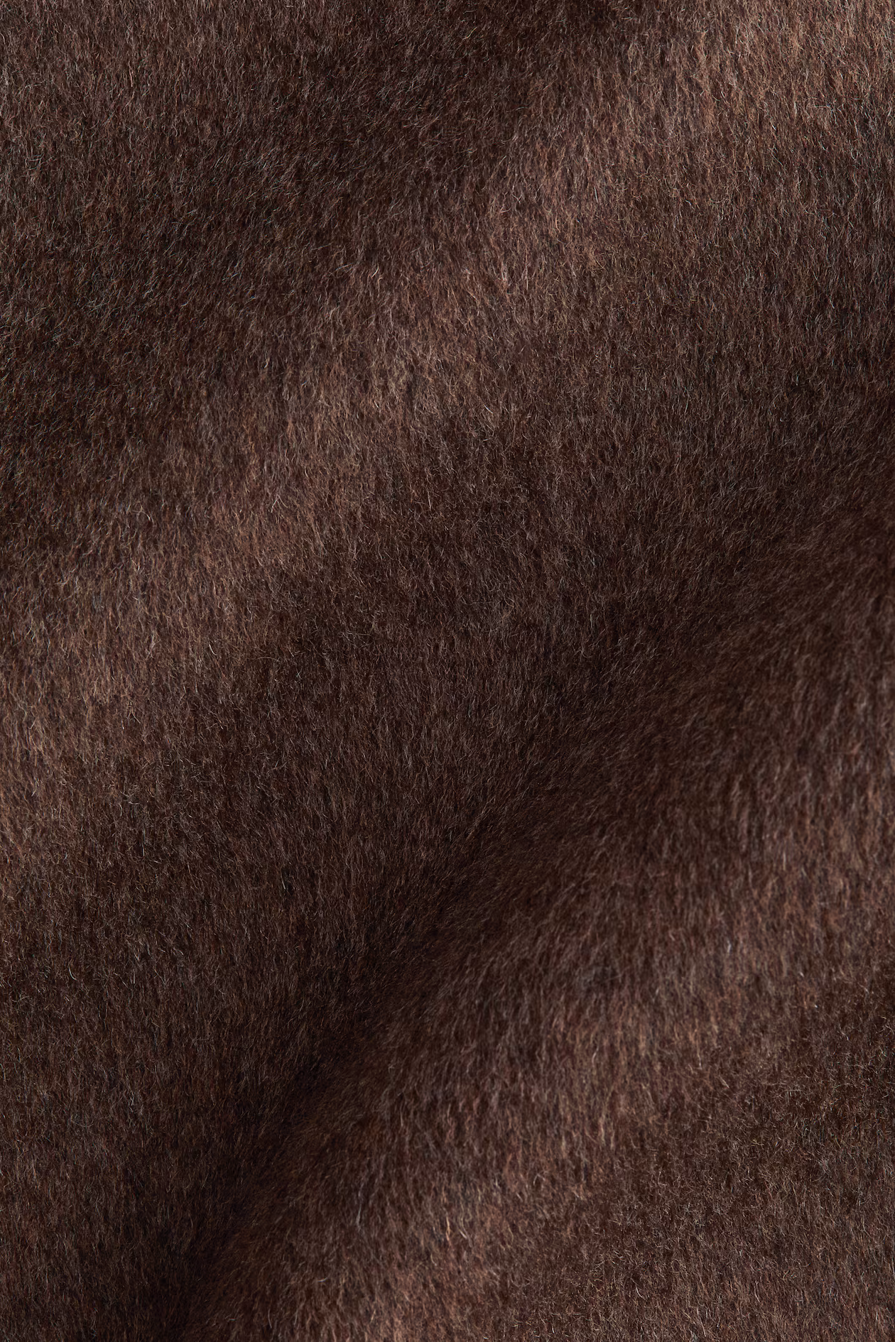 Long, loose-fit, handmade coat in a felted wool blend. Stand-up collar, open front with a removable tie belt at waist, dropped shoulders, and discreet side pockets. Vent at back. Unlined.