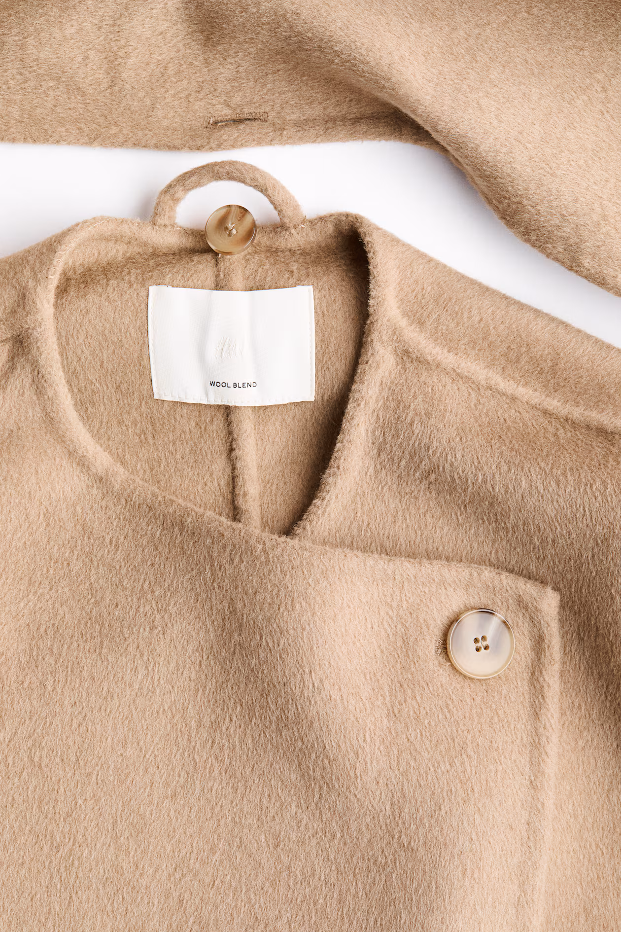 Oversized, handmade coat in a woven wool blend with a brushed finish. Wide, removable scarf to wrap around neck, round neckline, wrapover front with a button at top, and discreet side pockets. Vent at back. Unlined.