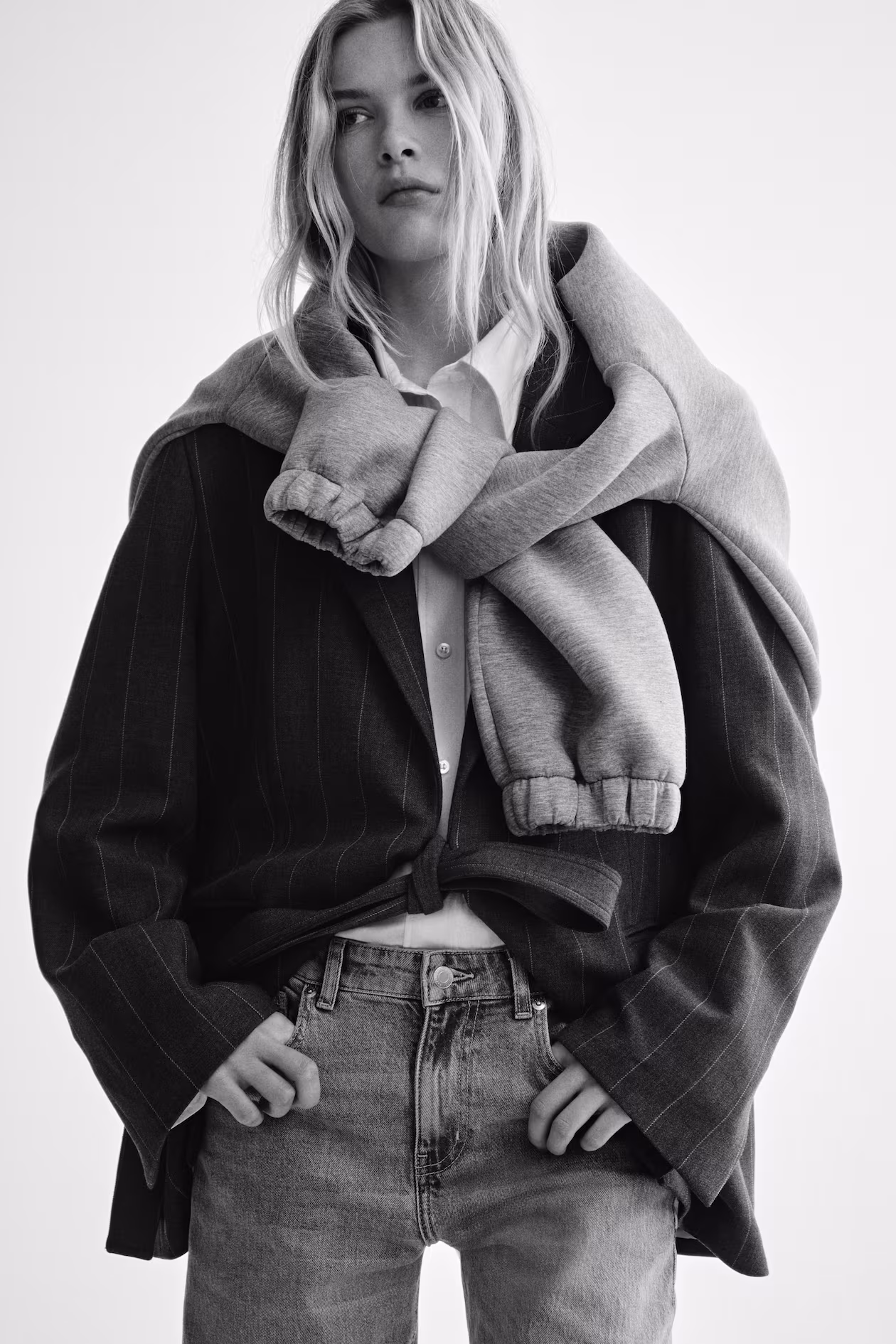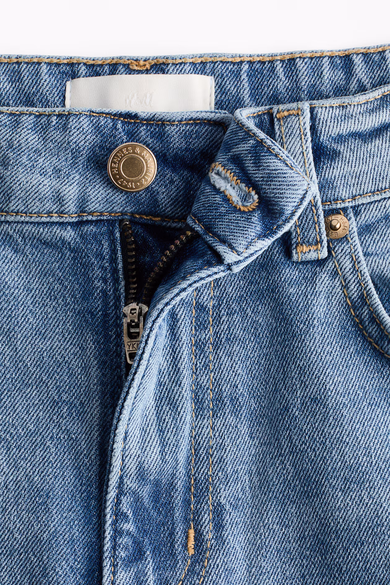 5-pocket jeans in washed cotton denim. High waist, zip fly and button and straight, wide legs.