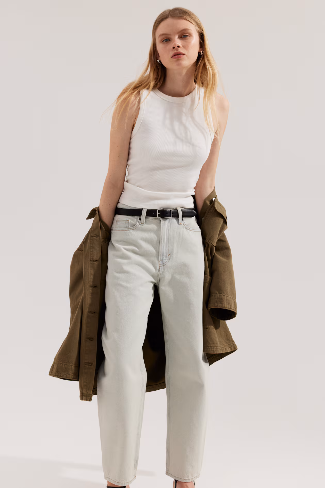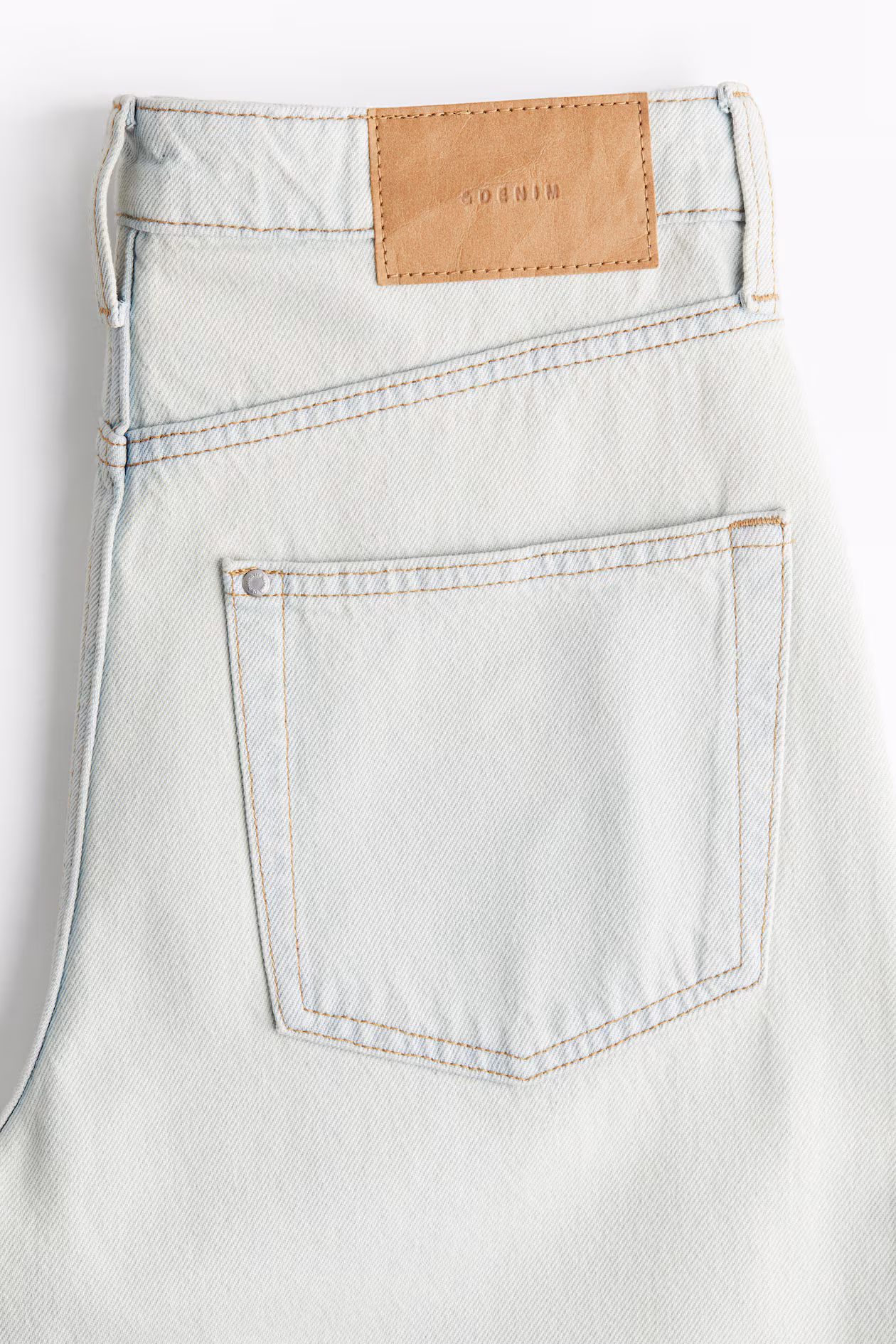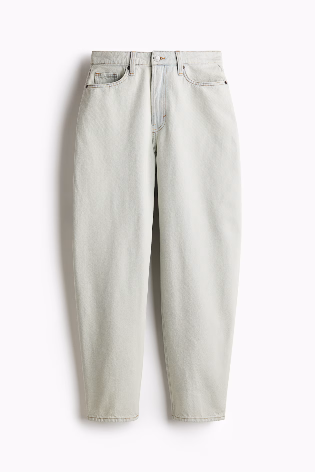 5-pocket jeans in rigid denim that feels firm at first, softening and relaxing with wear. Loose fit from hip to thigh. High waist and zip fly with button. Voluminous, curved legs, tapered to hems. Regular length, designed to fall at top of foot with little or no stacking. A relaxed and cool denim statement.