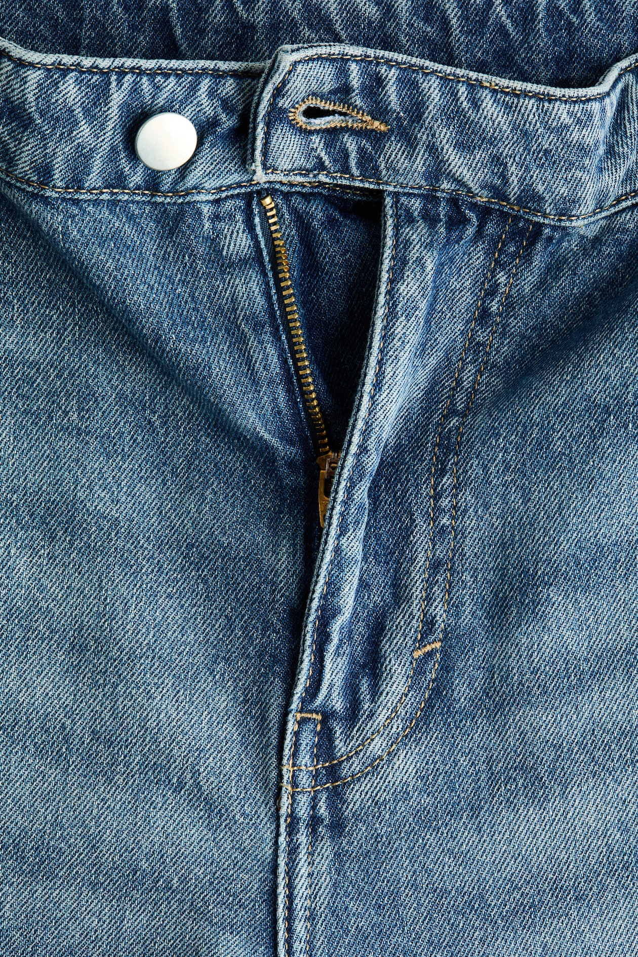 Jeans in rigid cotton denim that feels firm at first, softening and relaxing with wear. Regular fit from hip to thigh. High waist, extended waistband tab with button, and zip fly. Discreet side pockets and patch back pockets. Curved voluminous legs, tapered to hems. Regular length, designed to fall at top of foot with little or no stacking. A relaxed and cool denim statement.