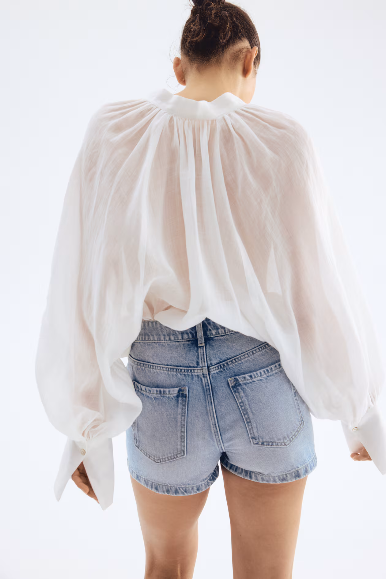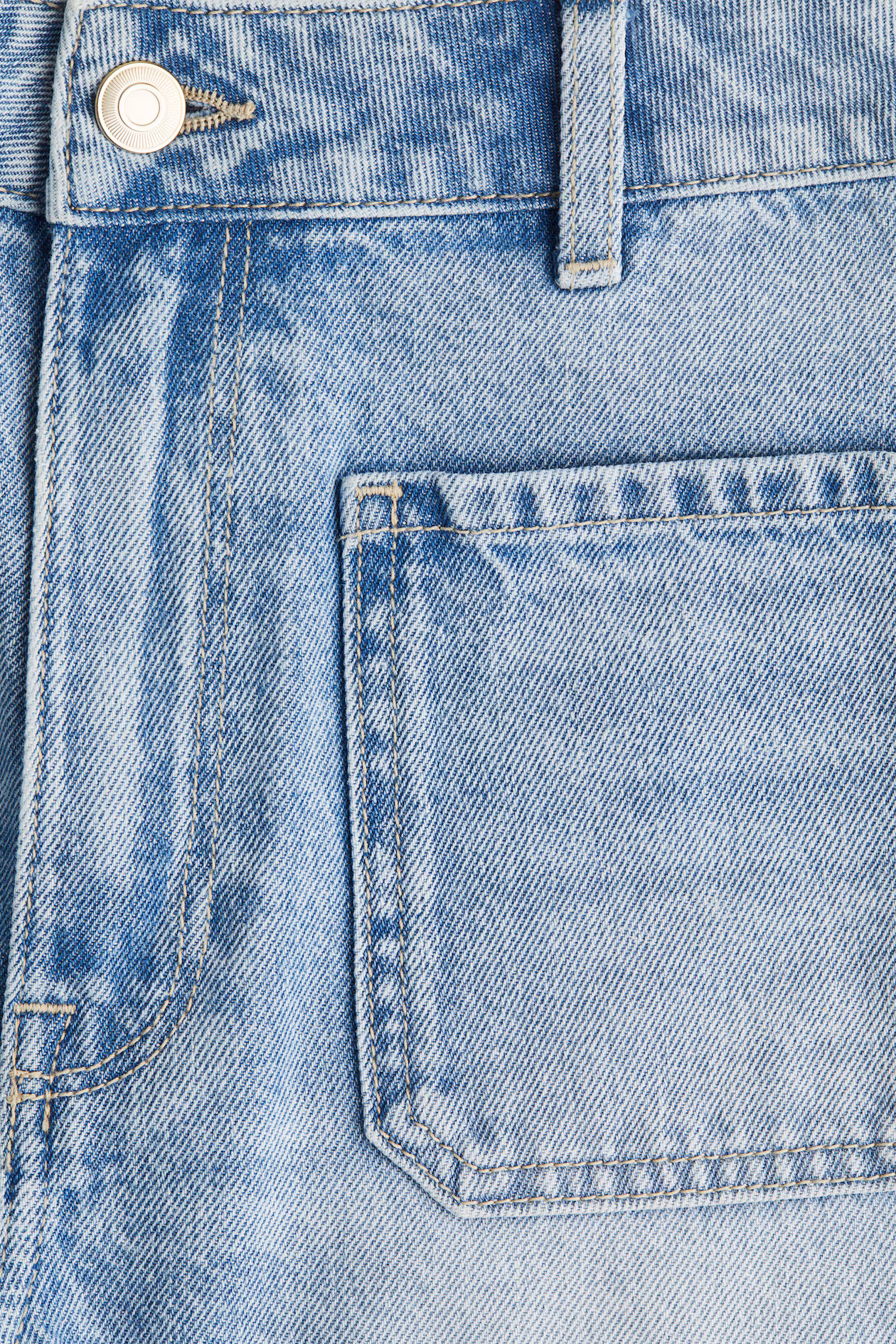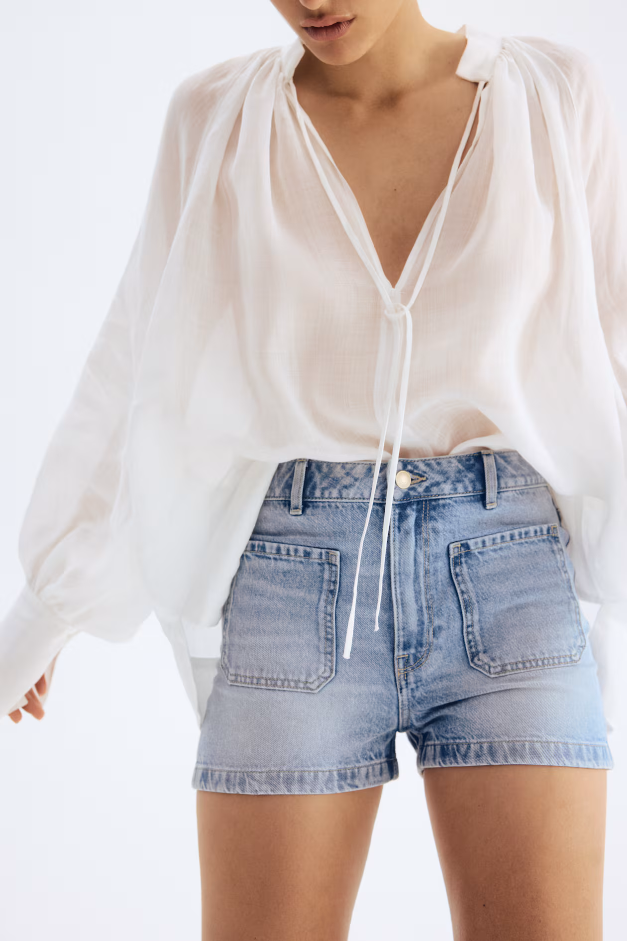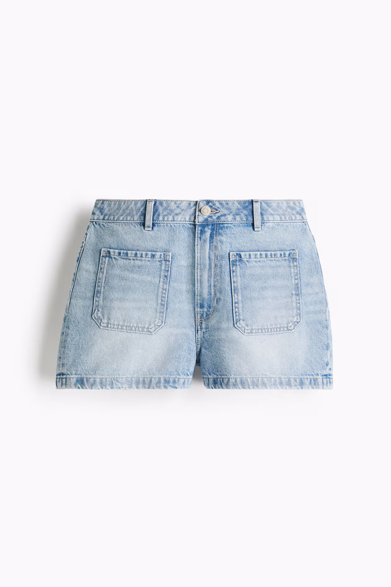 Shorts in cotton denim. High waist, zip fly with button, open front pockets, and open back pockets.