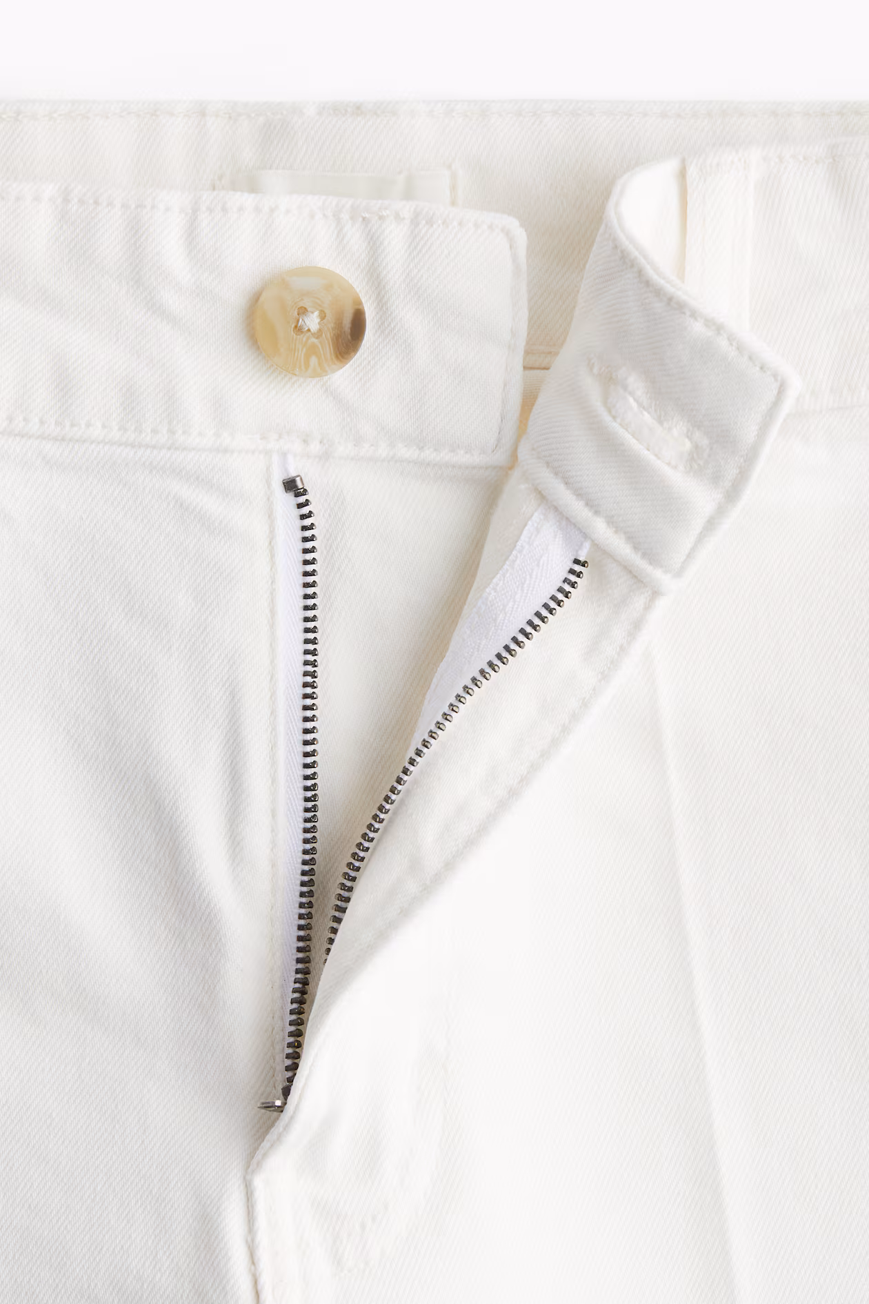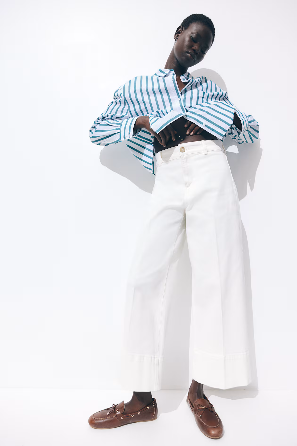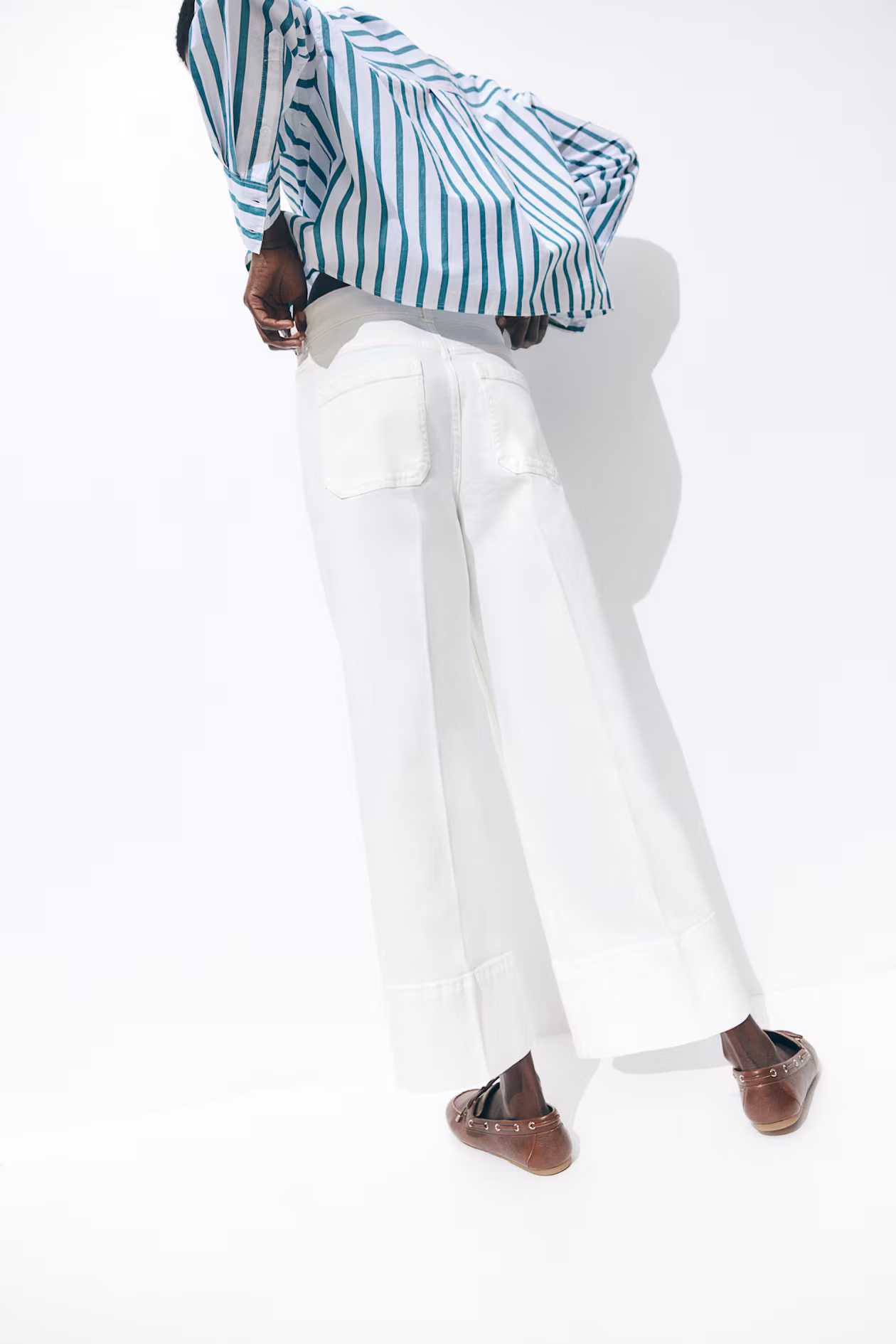 Wide-leg jeans in cotton denim with gentle stretch for added comfort. Regular fit from waist to hip and wide cut from thigh to hem. High waist and zip fly with button, patch back pockets, and shorter legs, designed to hit above ankle bone. A wardrobe essential.