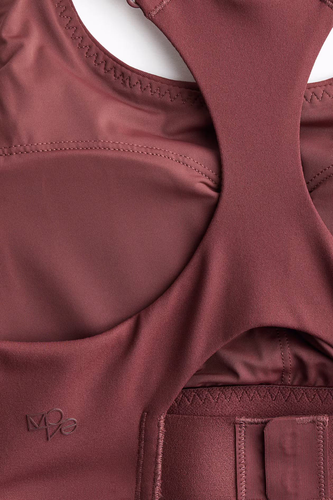 Sports bra in functional fabric made with snug-fitting ShapeMove™ for added support when moving and DryMove™ to wick away moisture from skin. Wide, adjustable shoulder straps, racer back in mesh with a cutout section, and lined cups with removable inserts for shaping and adjustable fit. Hook-and-eye fastening at back. Maximum support for high-intensity workouts.