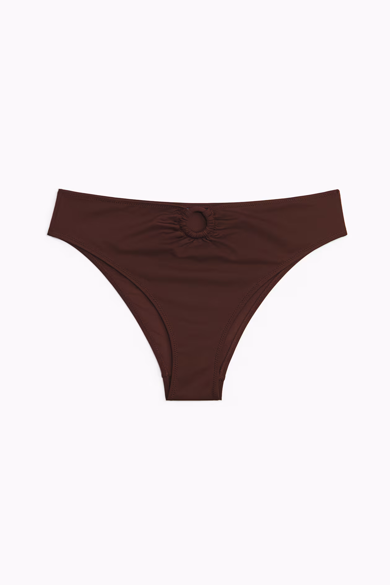 Fully lined bikini bottoms. High waist, covered ring at front, and cutaway coverage at back.