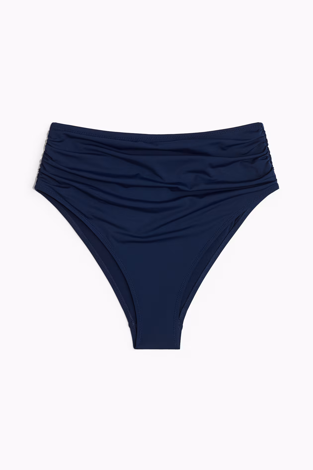 Fully lined bikini bottoms. High waist, gathered seam at sides and back for a gently draped effect, and cutaway coverage at back.
