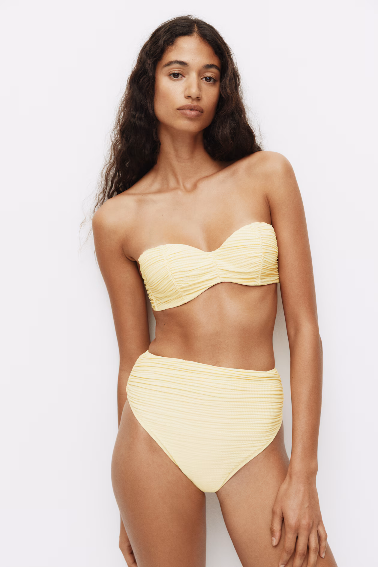 Fully lined bikini bottoms. High waist, gathered seam at sides and back for a gently draped effect, and cutaway coverage at back.