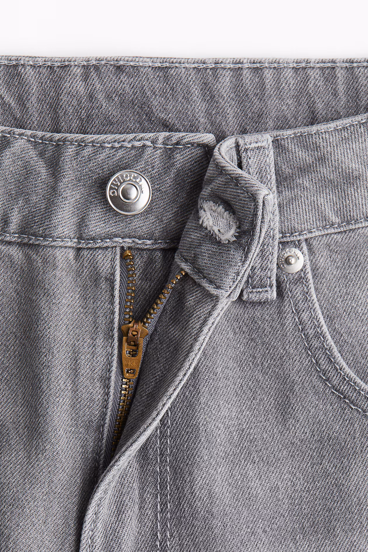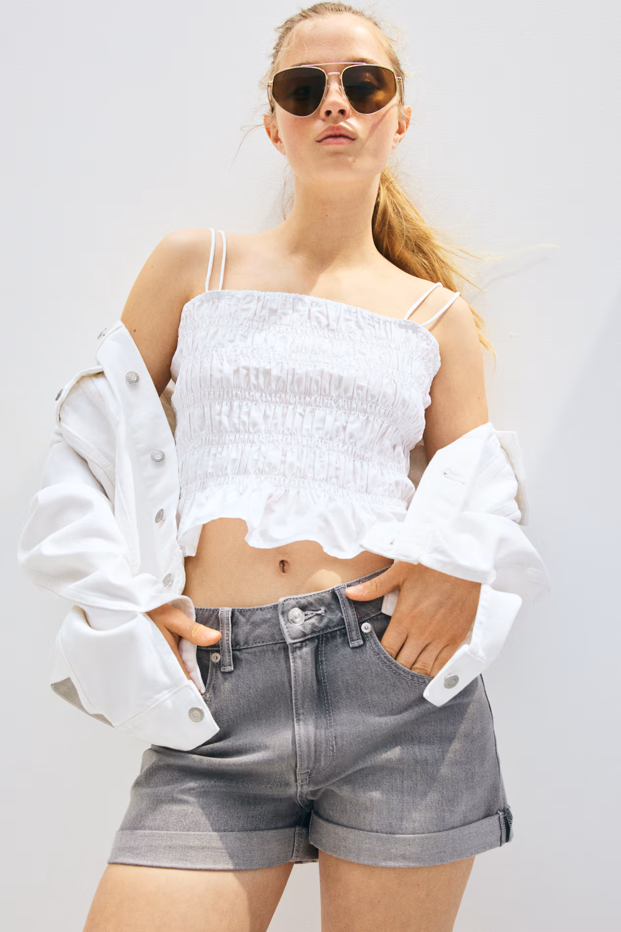 5-pocket shorts in rigid cotton denim. High waist, zip fly with button, and sewn foldover cuffs.
