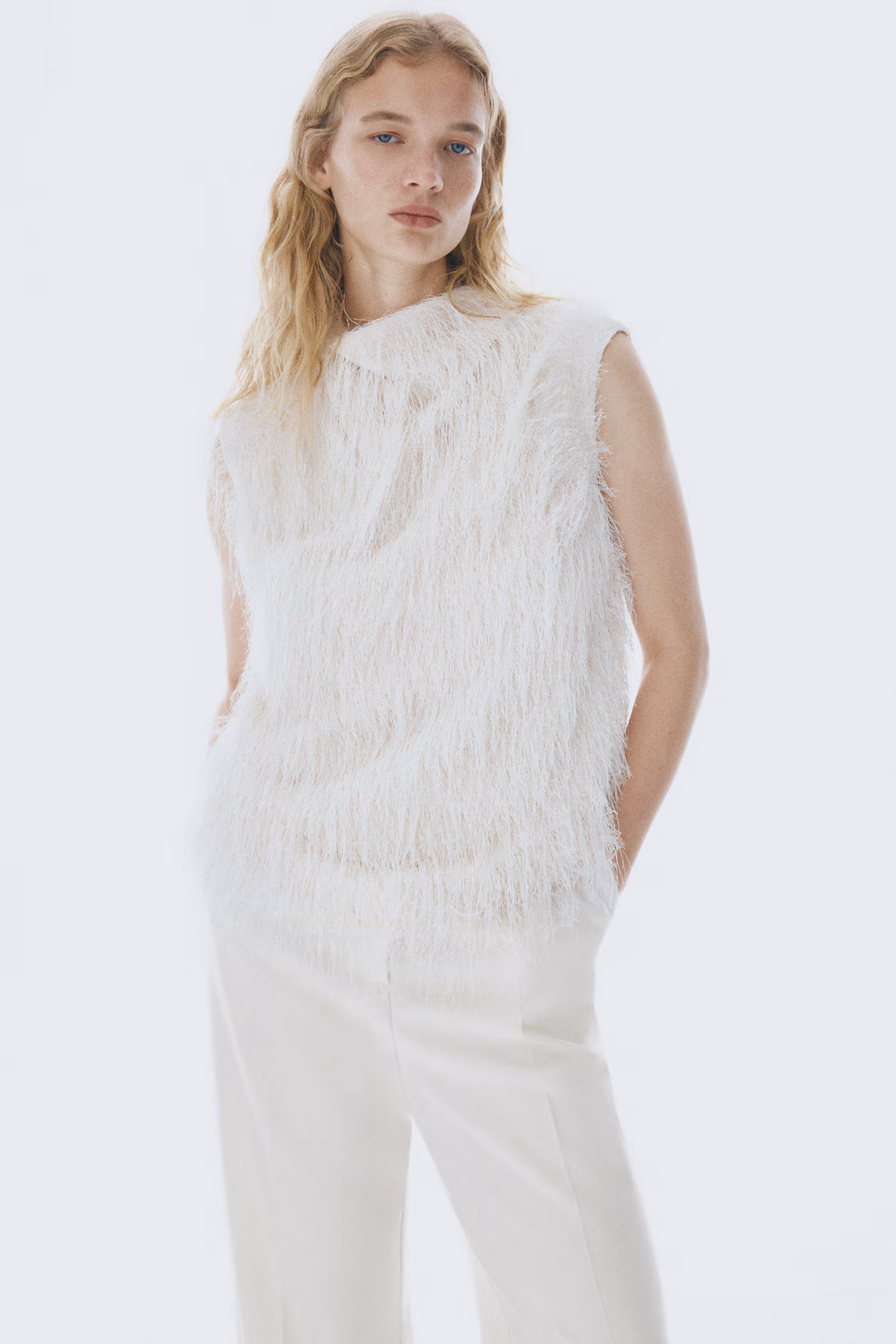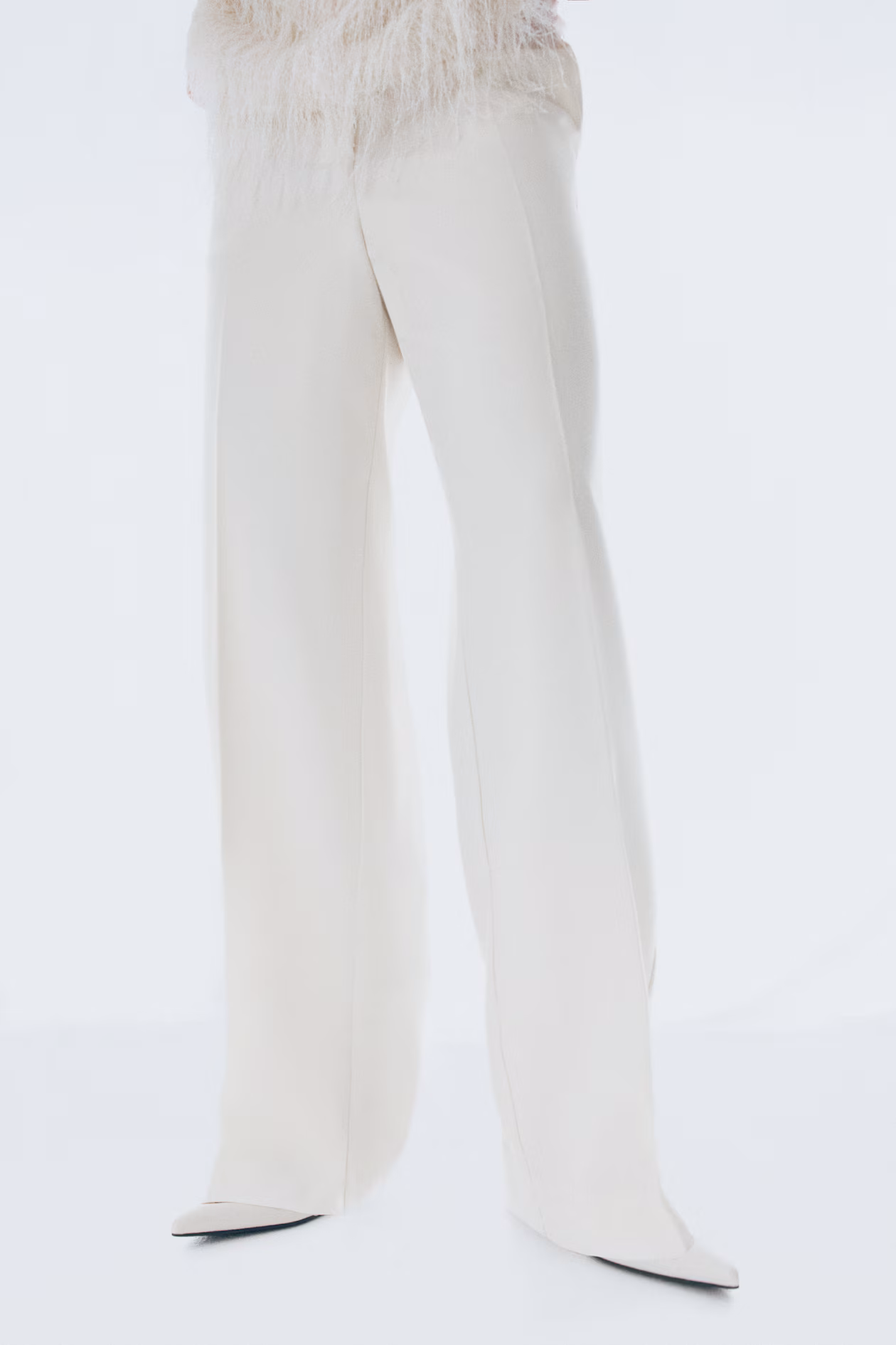 Slim-fit dress pants in woven fabric with creases at front and back. High waist, extended waistband tab with hook-and-eye fastening, and zip fly with concealed button. Diagonal side pockets, mock welt back pockets, and straight legs.