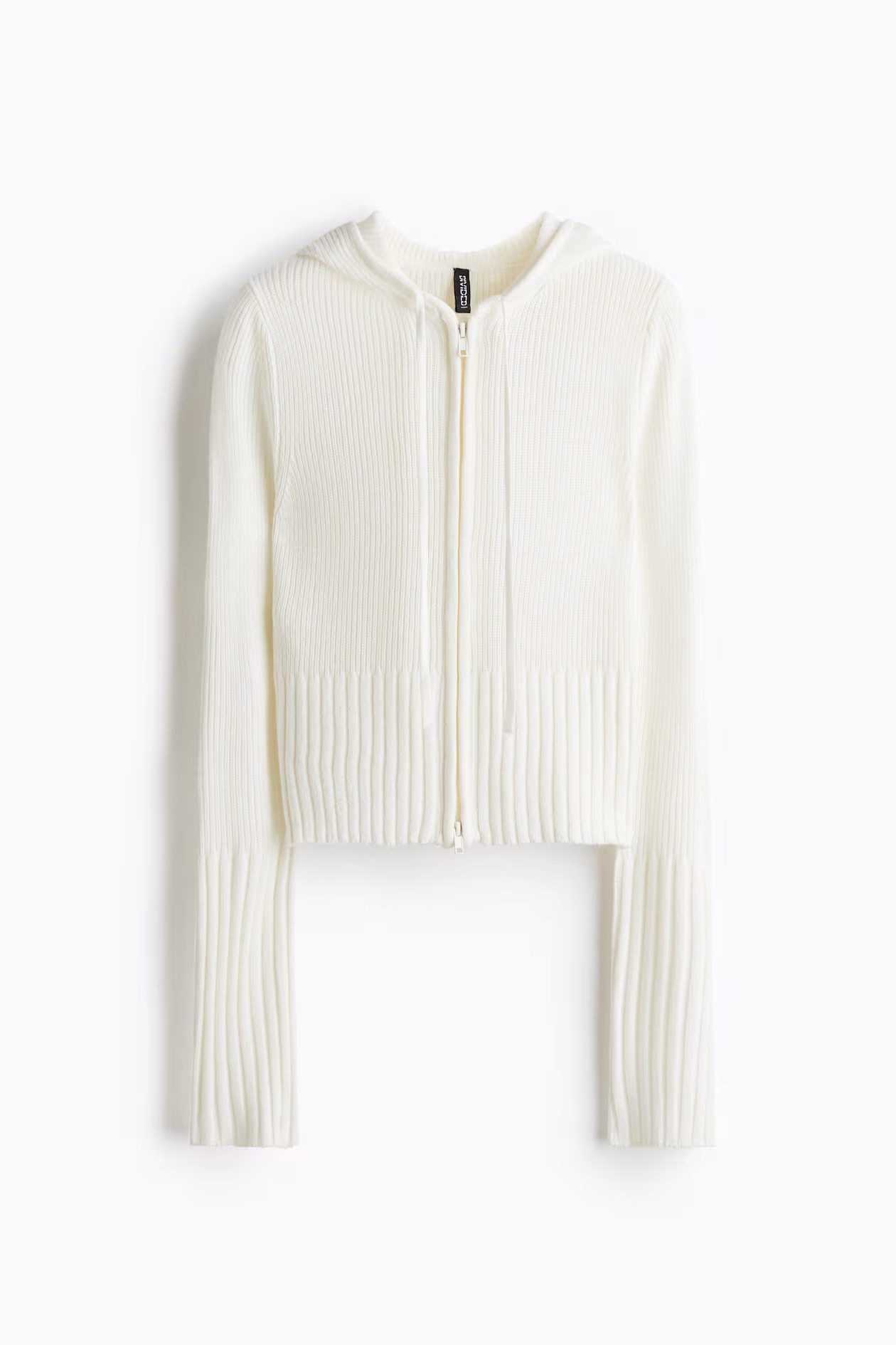 Short, fitted cardigan in a soft knit. Hood with drawstring, concealed two-way zipper at front, and wide, ribbed trim at cuffs and hem.