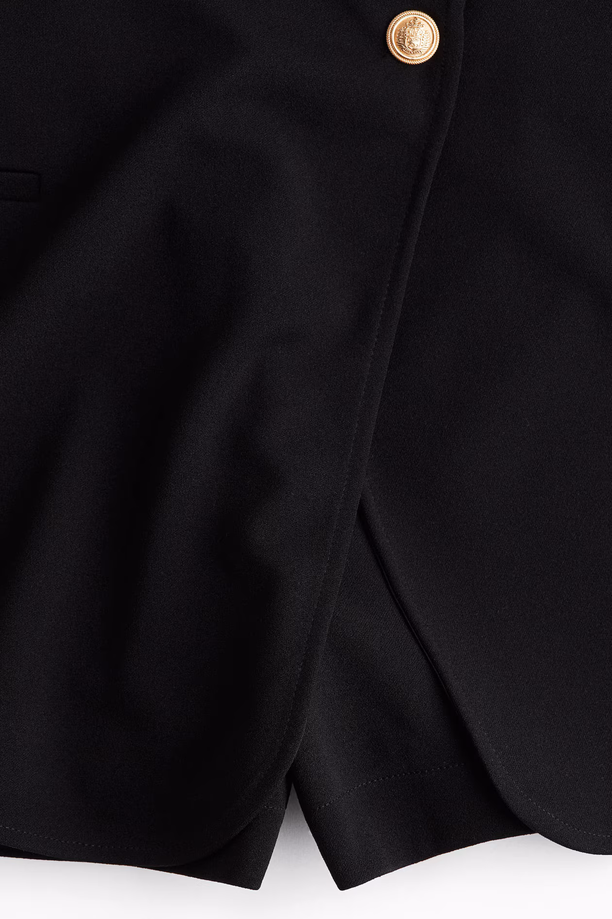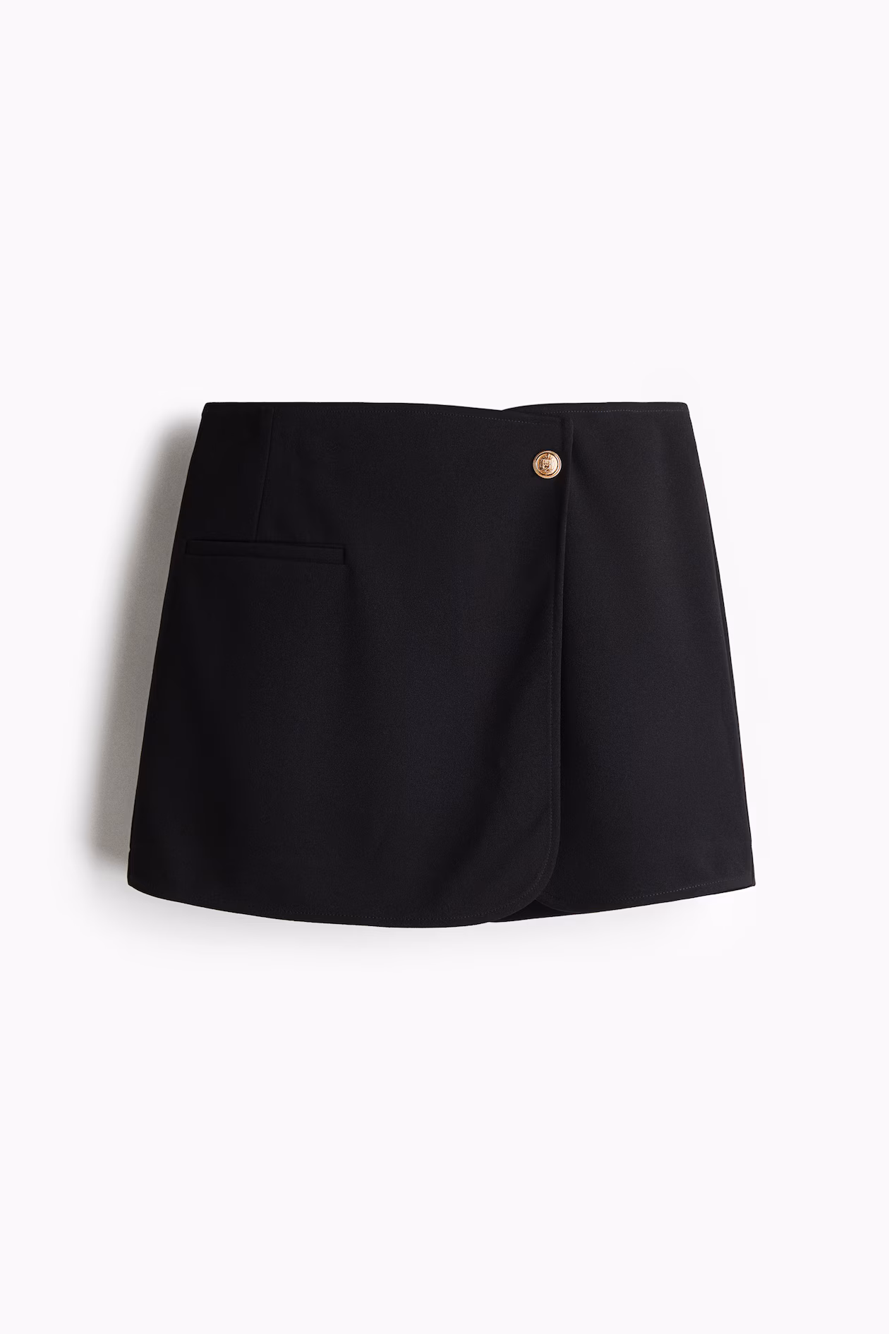 Short, wrap-front skort in thick interlock jersey. High waist, concealed, elasticized waistband, and darts at back. Metal button at front and a mock welt pocket.