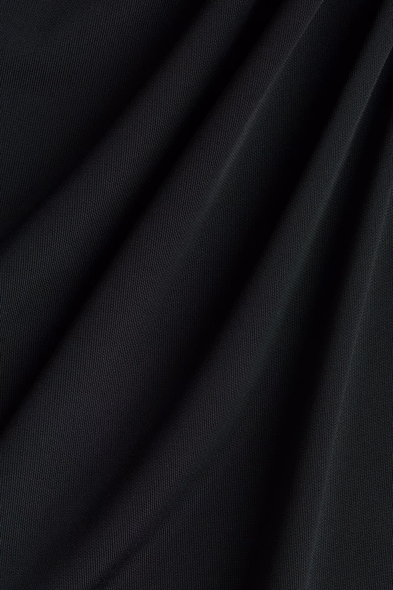 Fitted, calf-length dress in thick interlock jersey. Extra-narrow shoulder straps, cowl neck, and gathers at one side of waist for a gently draped effect. Partly lined.