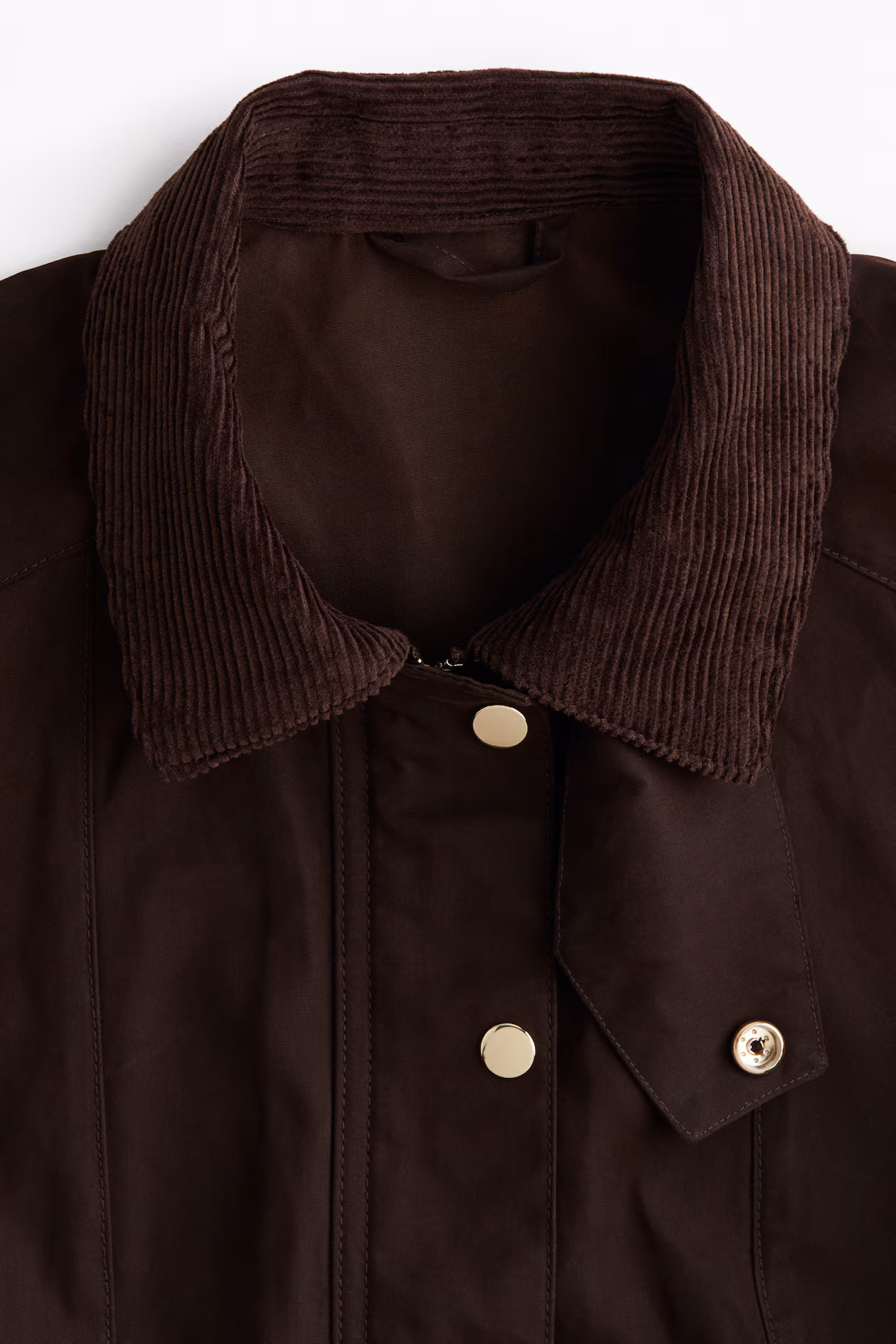 Short jacket in woven fabric. Cotton corduroy collar with tab and snap fastener. Zipper at front with wind flap and snap fasteners, yoke at back, and visible seams at front and back. Bellows front pockets with flap and snap fasteners. Unlined.