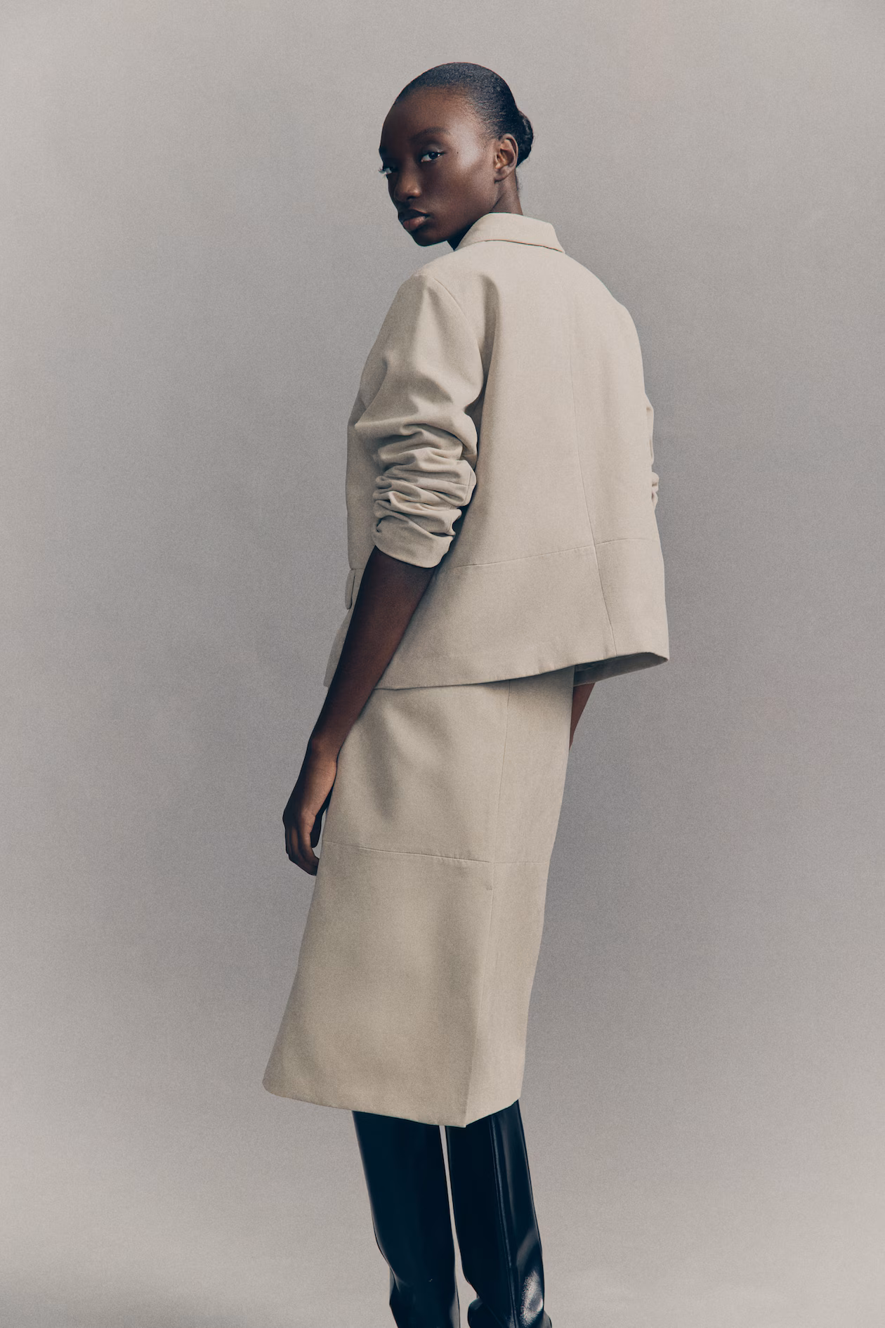 Jacket in woven fabric with a soft, napped finish. Notched lapels, buttons at front, and front pockets with flap. Lined.