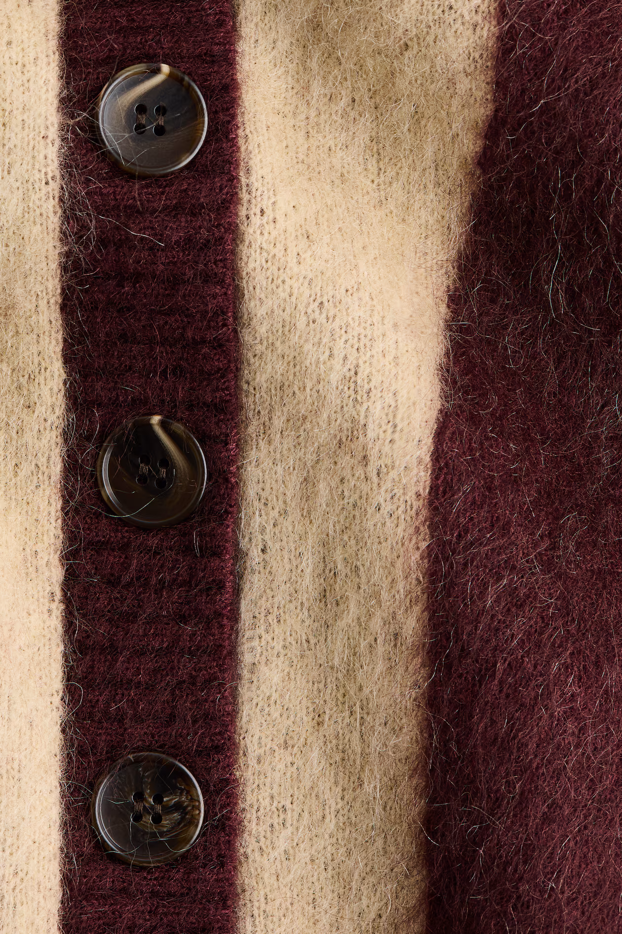 Loose-fit cardigan in a soft jacquard knit with mohair and wool content. Low-cut V-neck, long raglan sleeves, and a slit at sides of hem. Ribbing at neckline and placket.