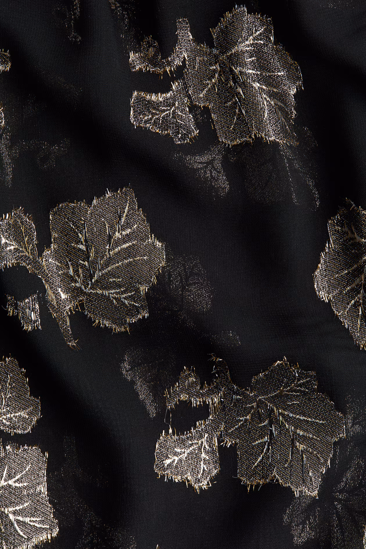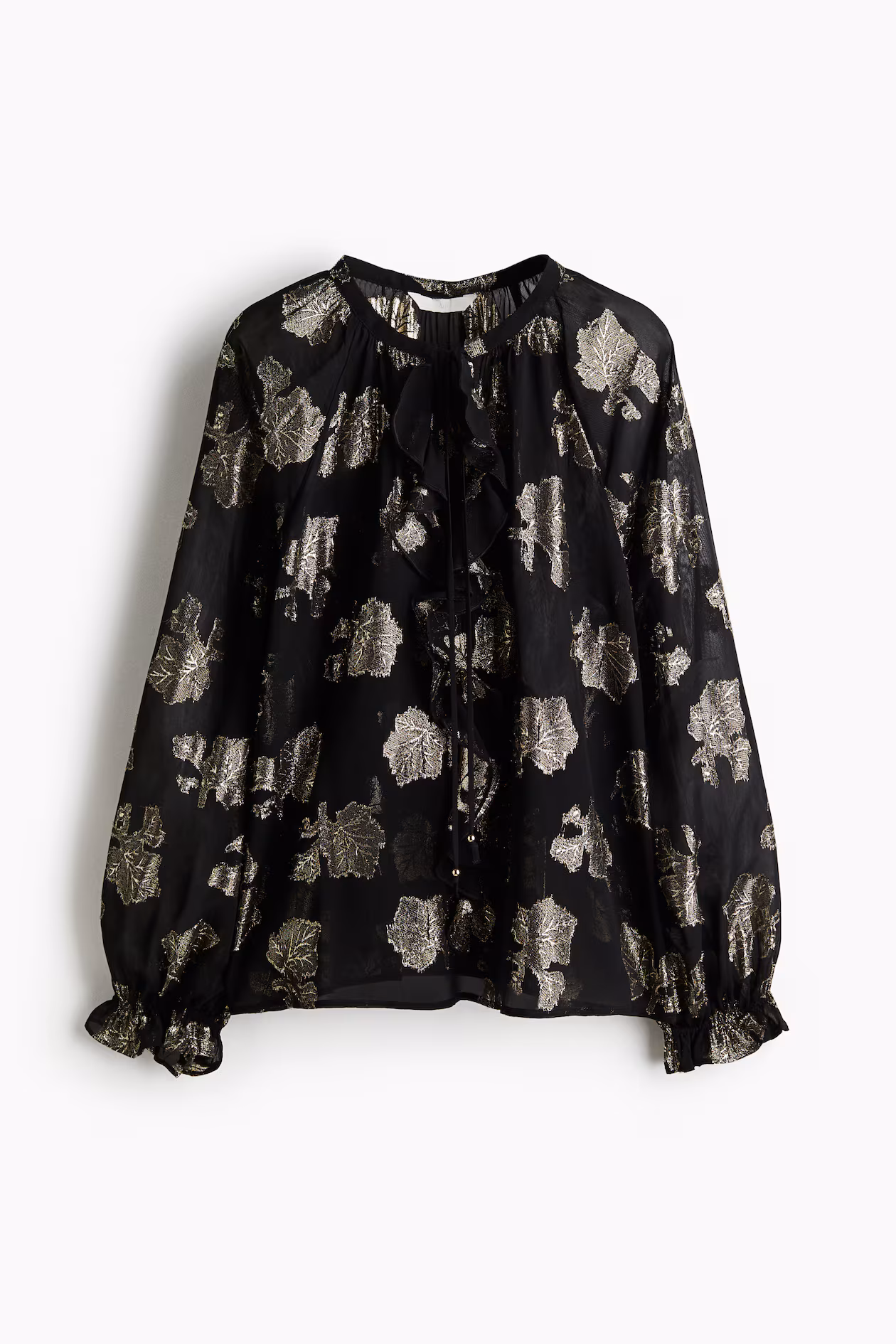 Loose-fit blouse in sheer, jacquard-weave fabric with vertical ruffle trim at front. Band collar with gathers at back, opening at front with extra-narrow ties, long raglan balloon sleeves, and ruffled cuffs with narrow elastic at wrists.
