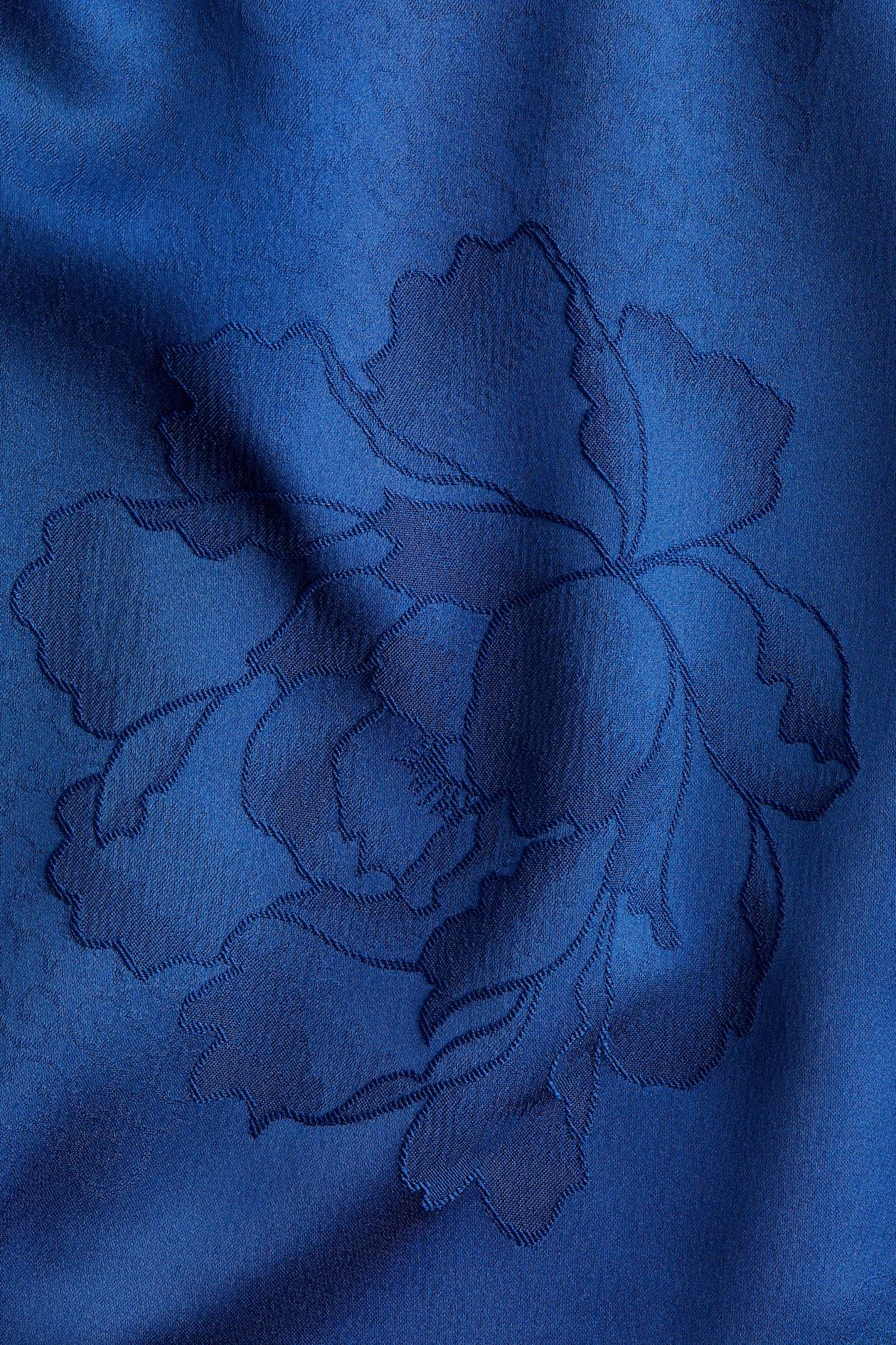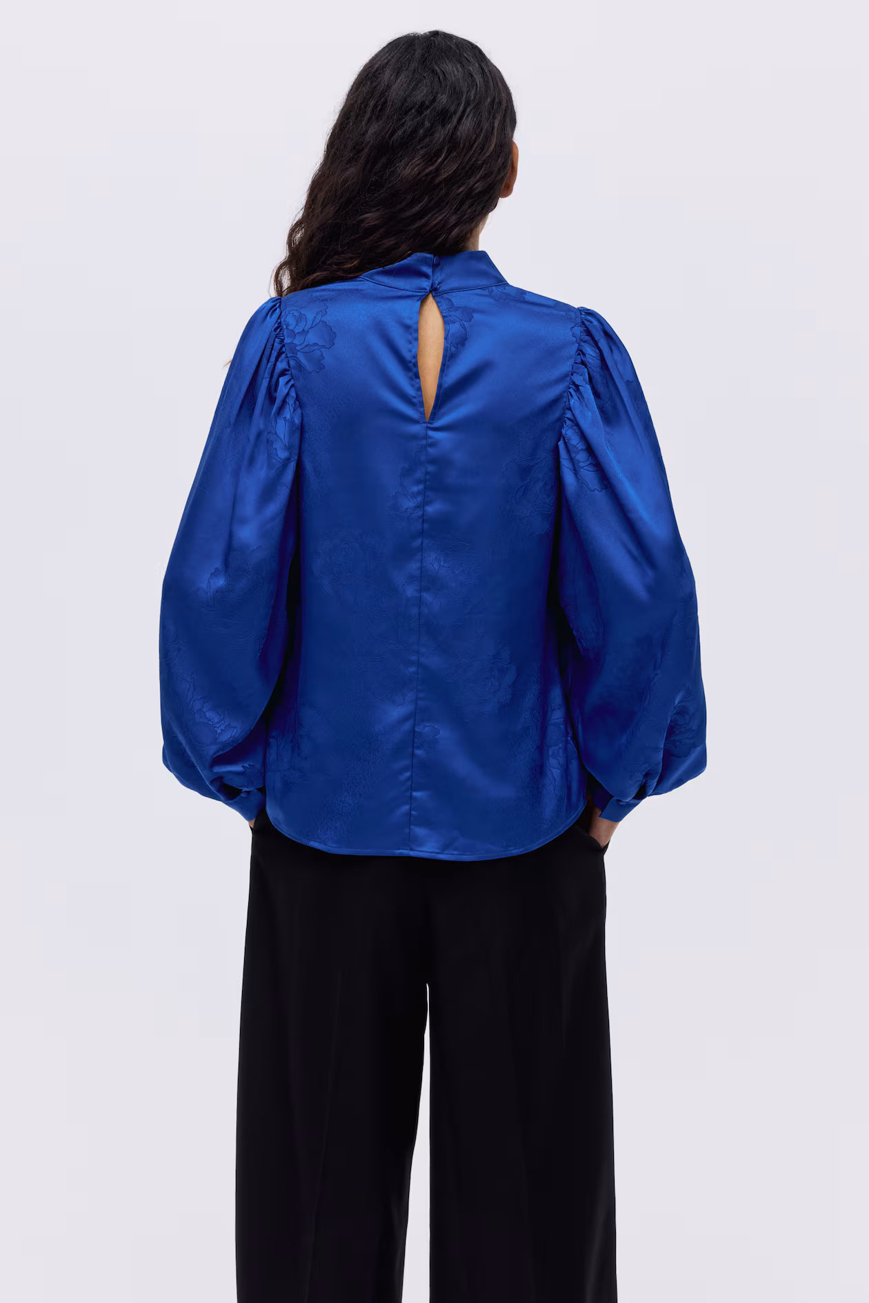 Fitted blouse in jacquard-weave fabric with a slight sheen. Stand-up collar, keyhole opening at back with covered buttons, and long balloon sleeves with a covered button at cuffs.