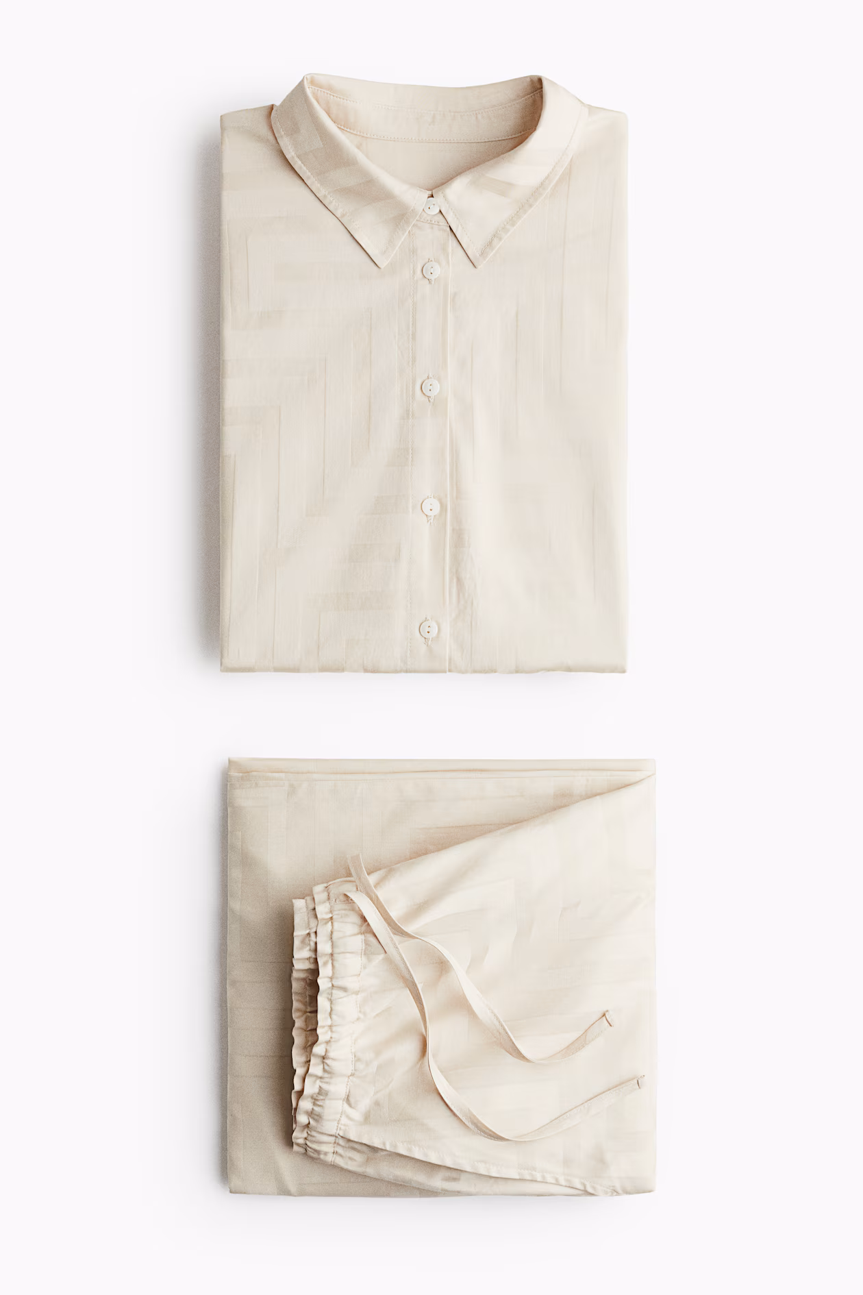 Pajamas with shirt and pants in soft, jacquard-weave cotton with a geometric pattern. Shirt with a turn-down collar, buttons at front, and dropped shoulders. Pants with an elasticized, drawstring waistband and wide legs.