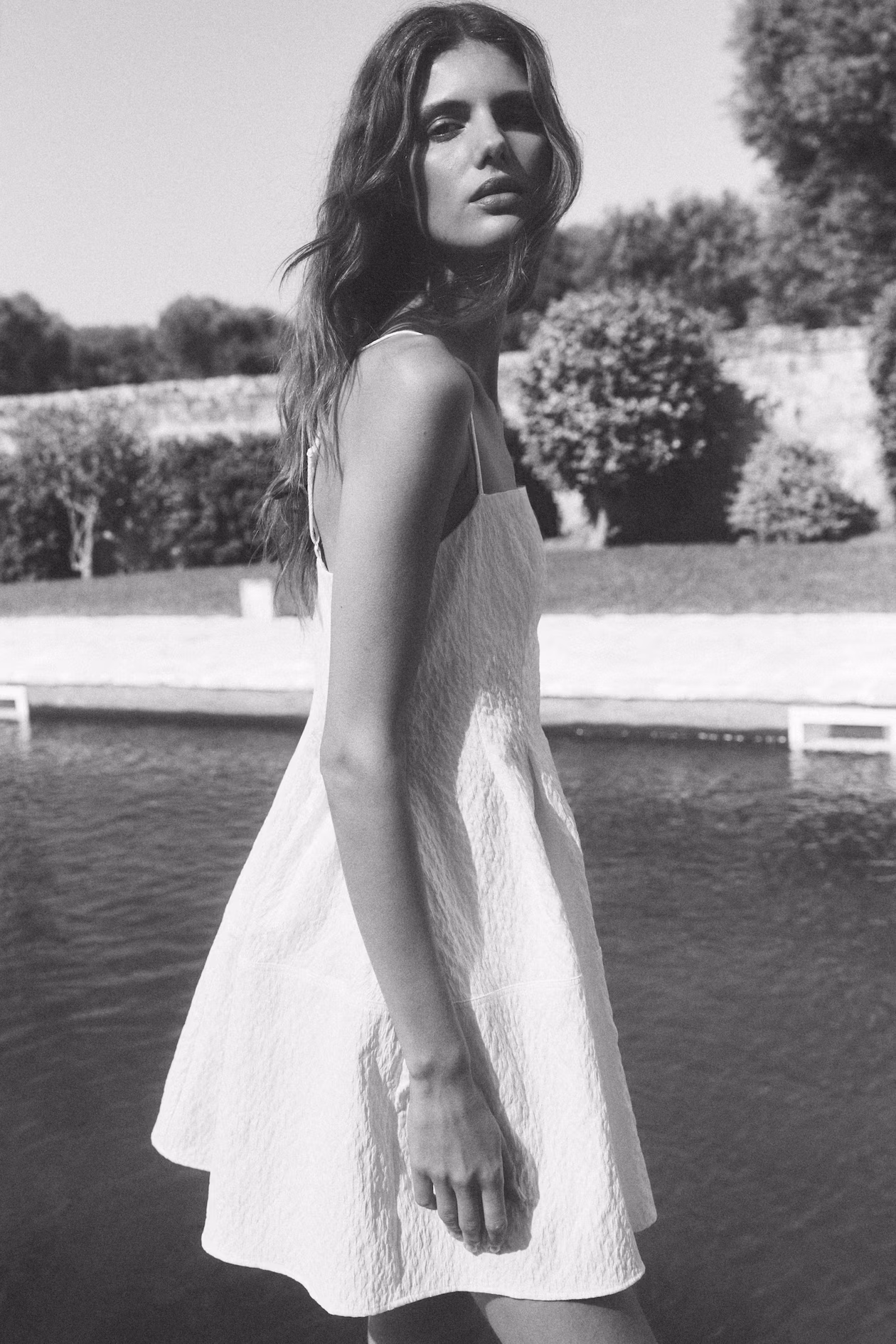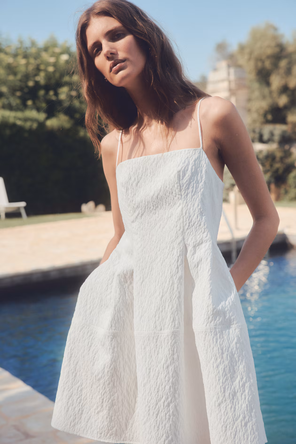 Short dress in jacquard-weave fabric with a fitted bodice. Adjustable, extra-narrow shoulder straps, straight neckline, and concealed zipper at back with hook-and-eye fastener. Pleats at waist and a flared skirt. Partly lined.
