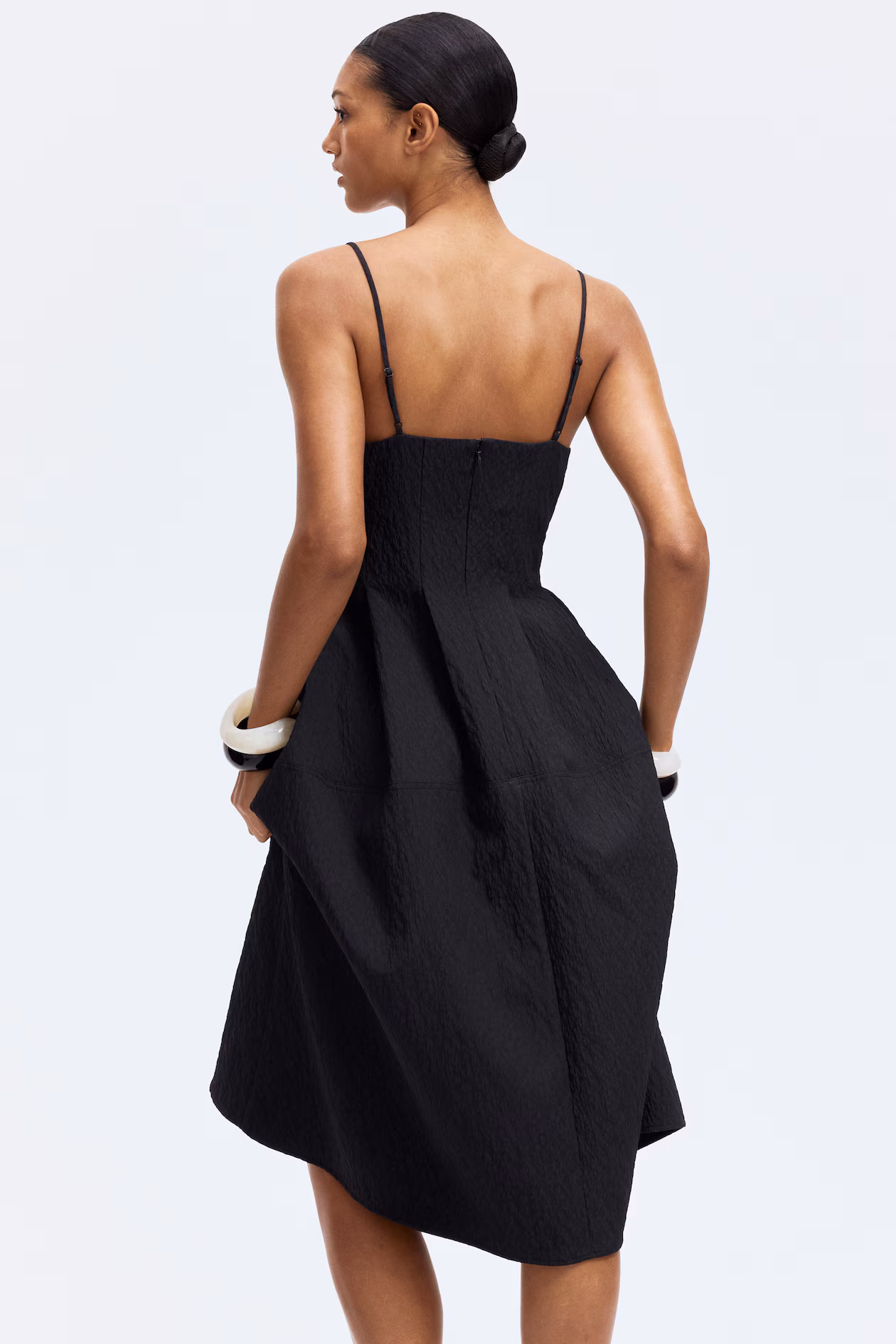 Calf-length dress in a jacquard weave with a fitted bodice and flared skirt. Narrow, adjustable shoulder straps, straight neckline, and shaping seams. Concealed zipper at back with hook-and-eye fastener, discreet side pockets, and pleats at waist for added volume. Partially lined.