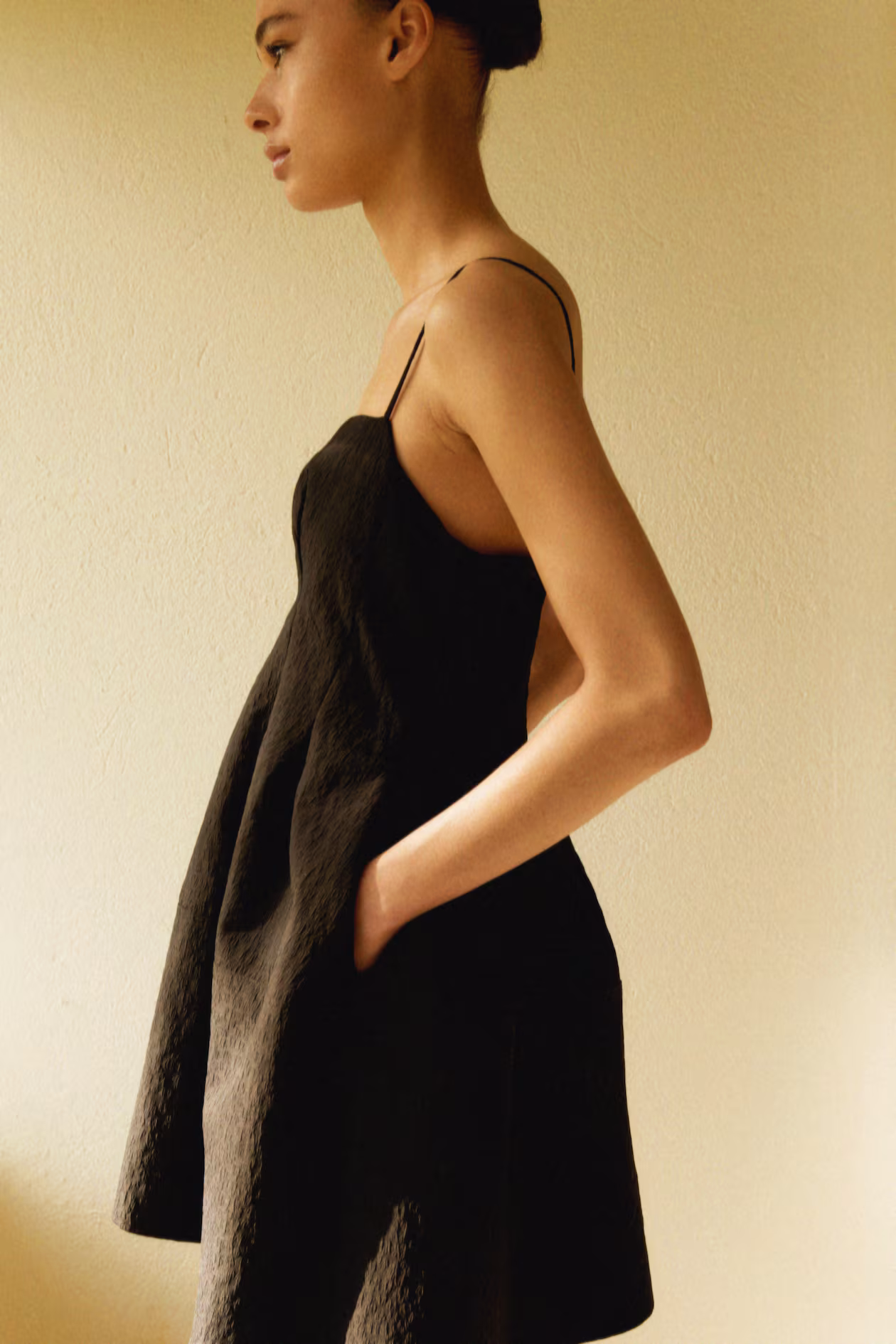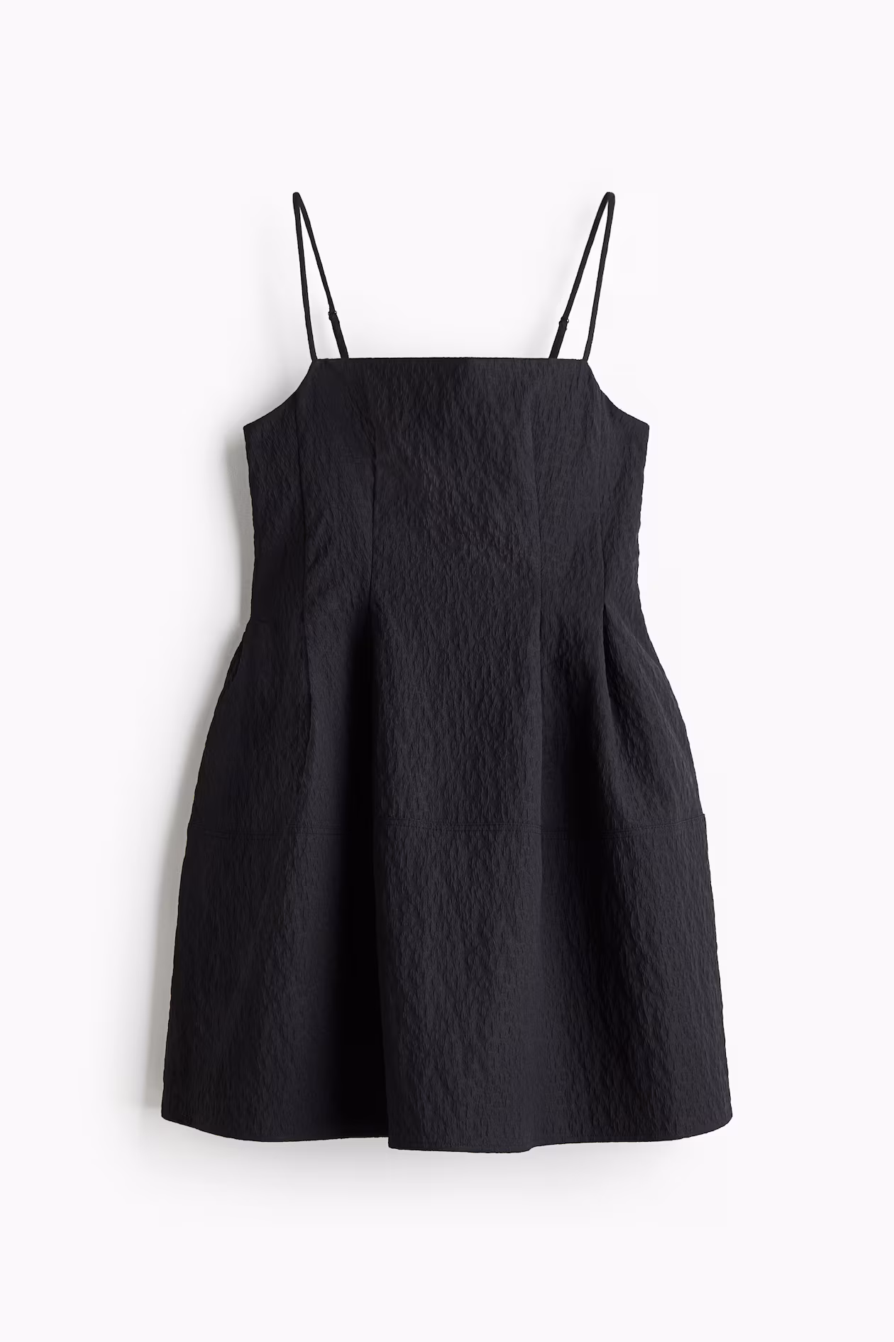 Short dress in jacquard-weave fabric with a fitted bodice. Adjustable, extra-narrow shoulder straps, straight neckline, and concealed zipper at back with hook-and-eye fastener. Pleats at waist and a flared skirt. Partly lined.