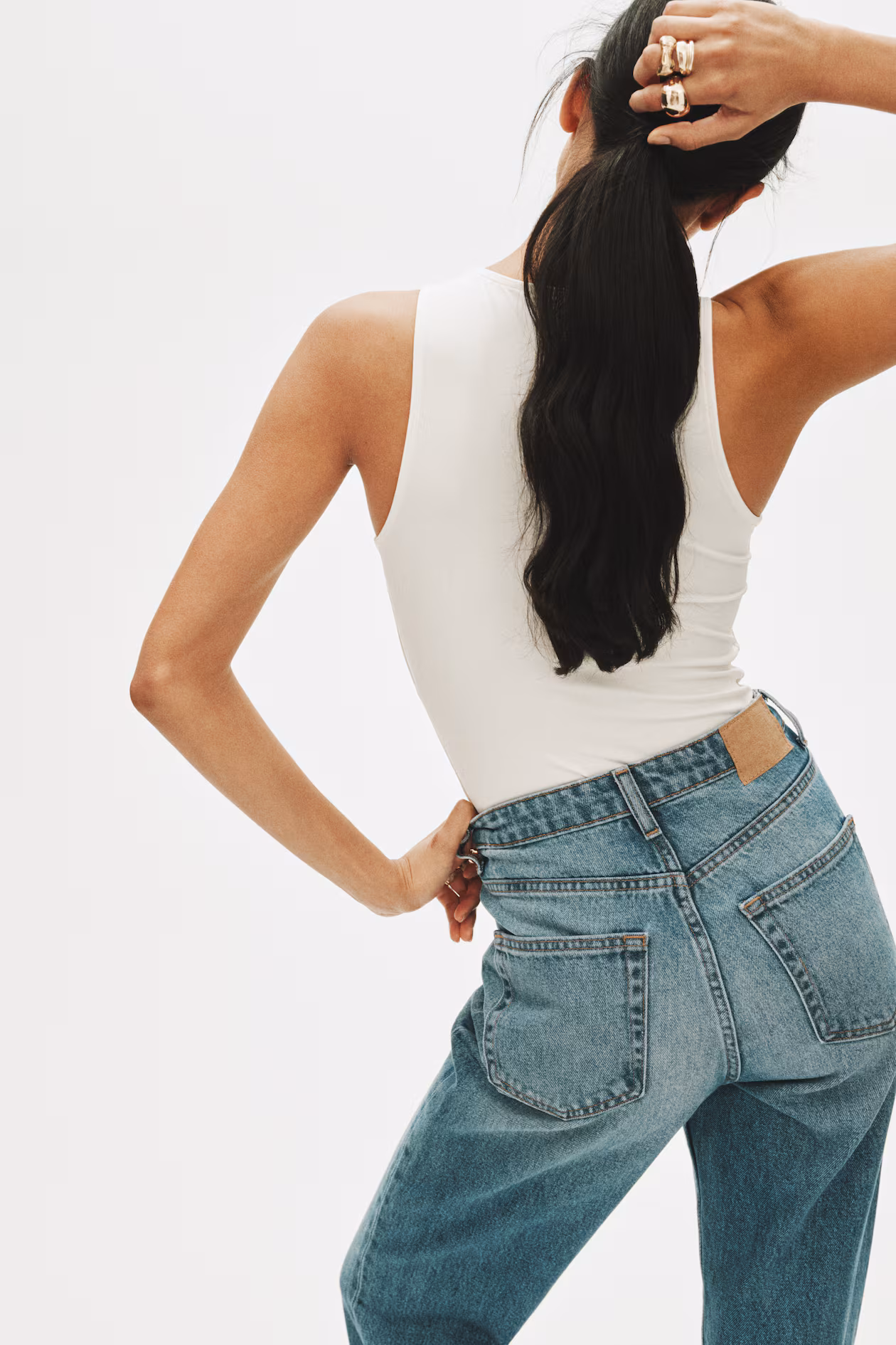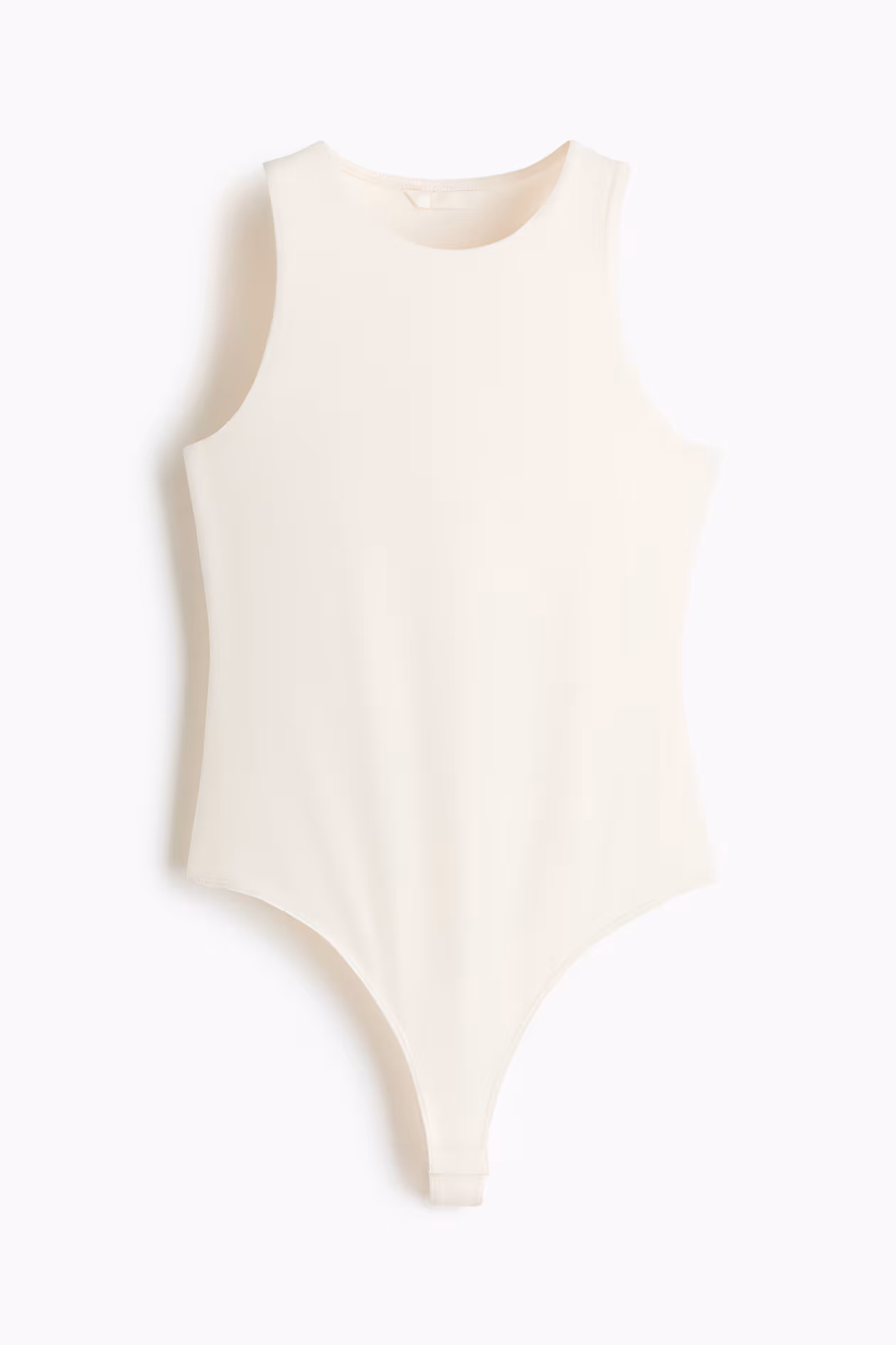 Sleeveless thong bodysuit in soft stretch jersey with a round neckline. Concealed snap fasteners at gusset. Partly lined.